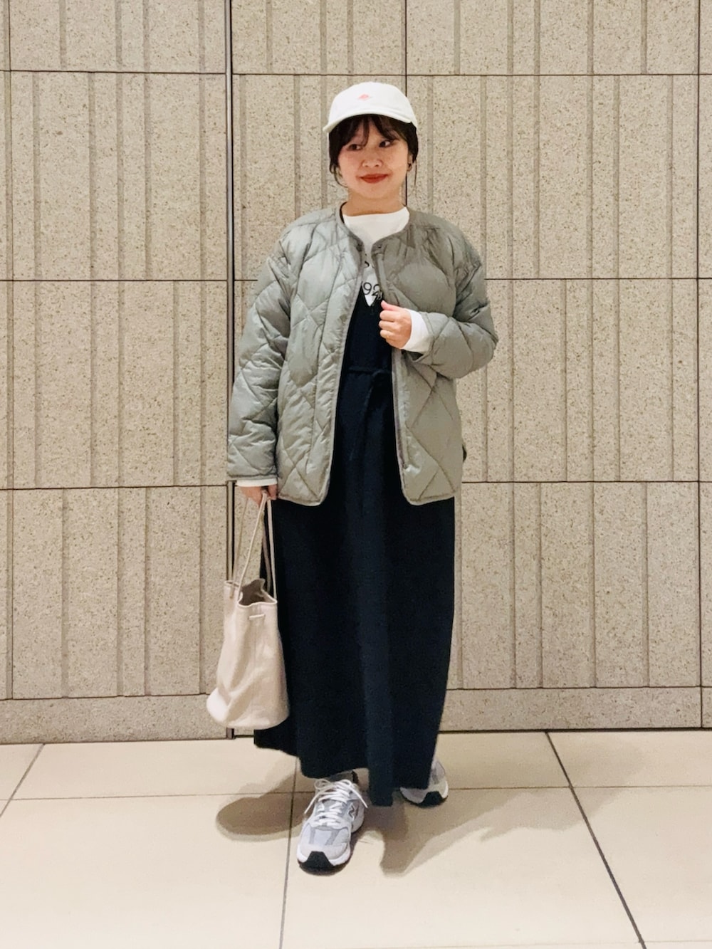Vネックワンピースとニューバランスで休日お出かけコーデにしました。小物でアイボリーカラーをプラスしてみました。