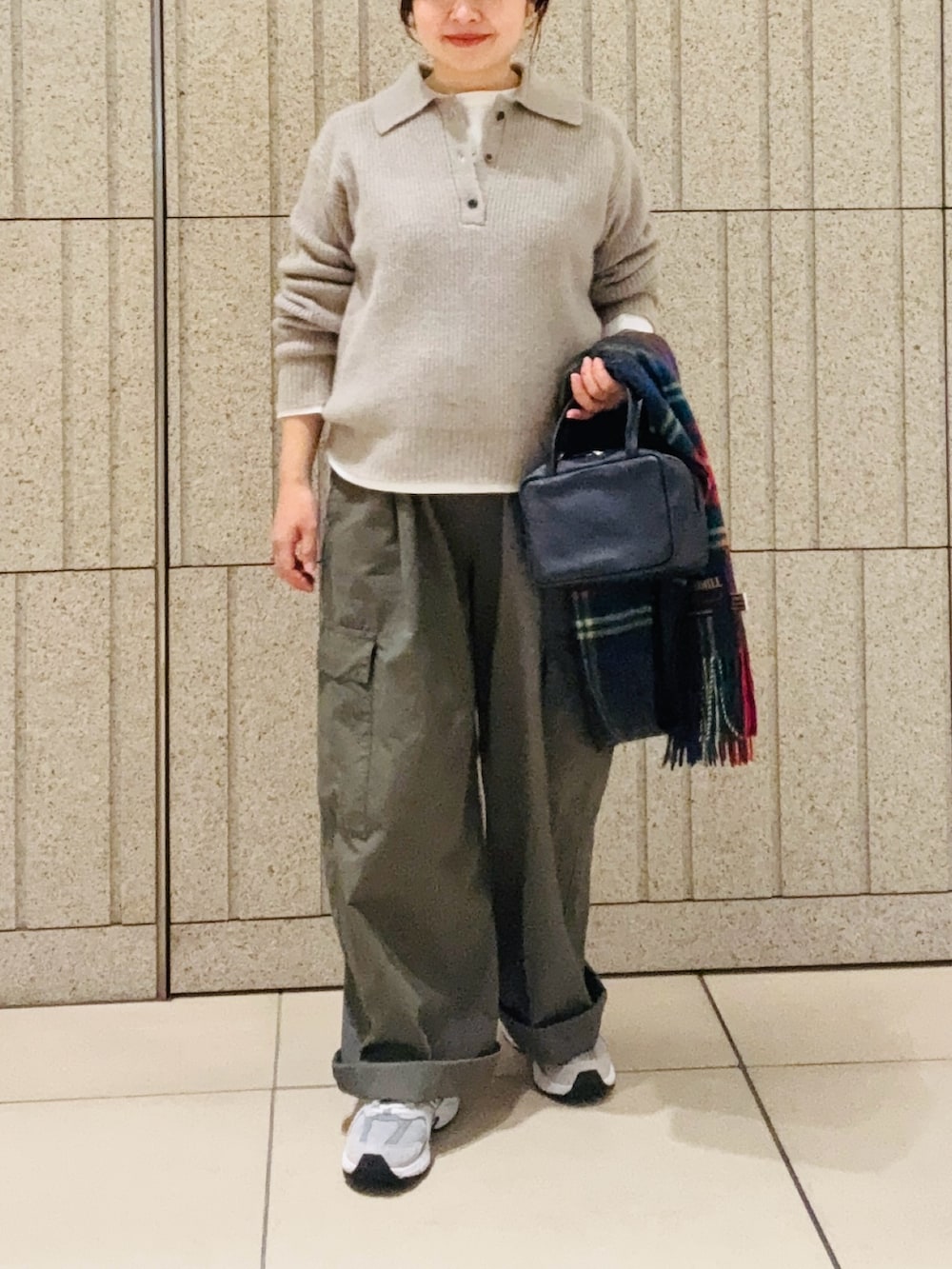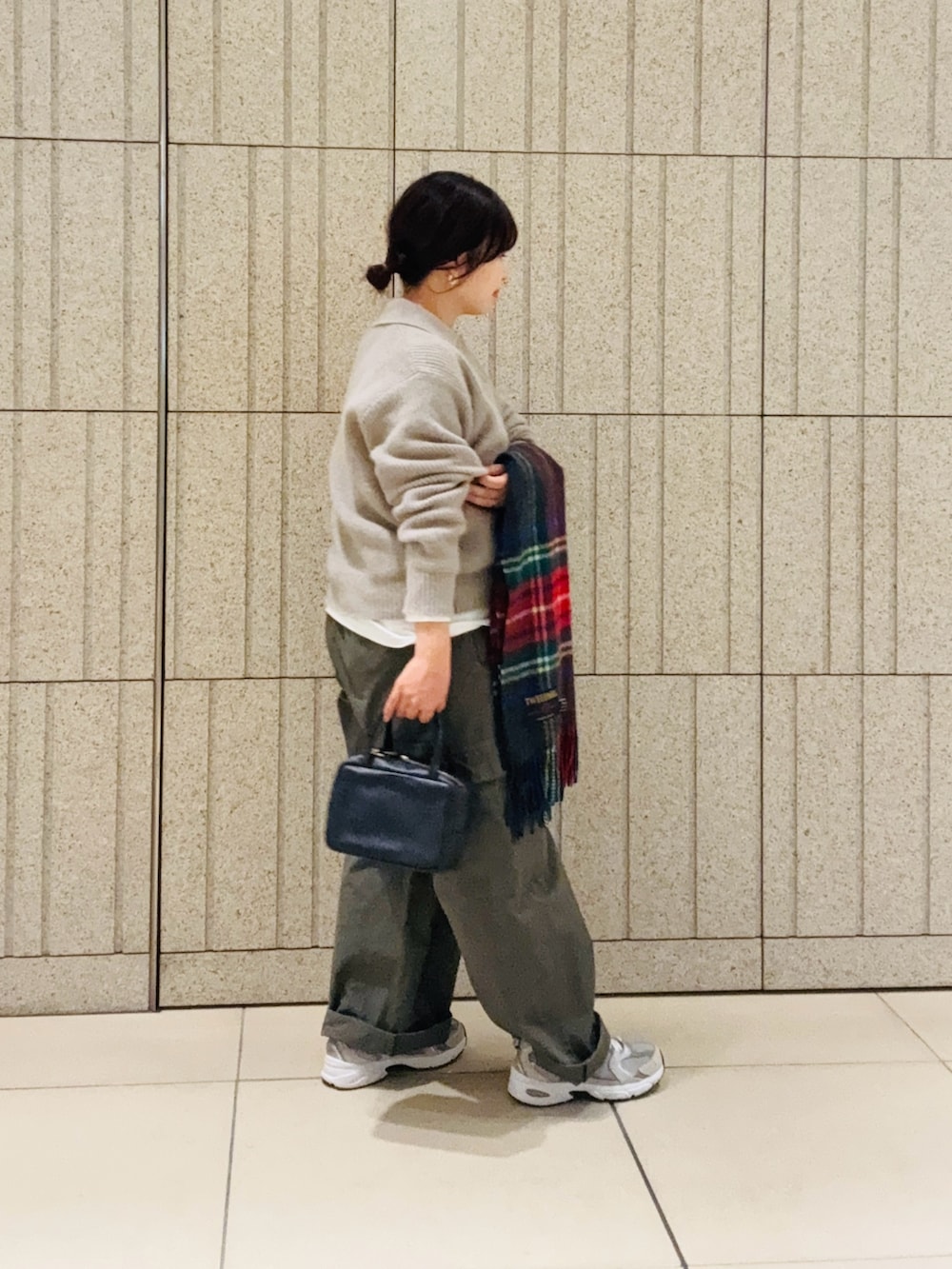 カジュアルにかぐれのユーティリティパンツにTWEED MILLの大判ストールを合わせた秋冬コーデにしました。