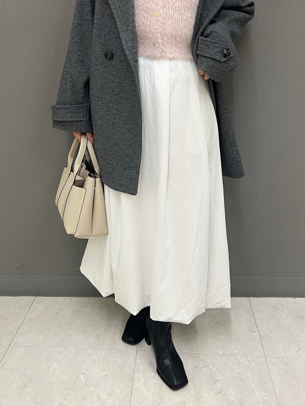 カーディガンのピンクが甘めなので、アウターとブーツはグレーとブラックを合わせて大人っぽくしました◎