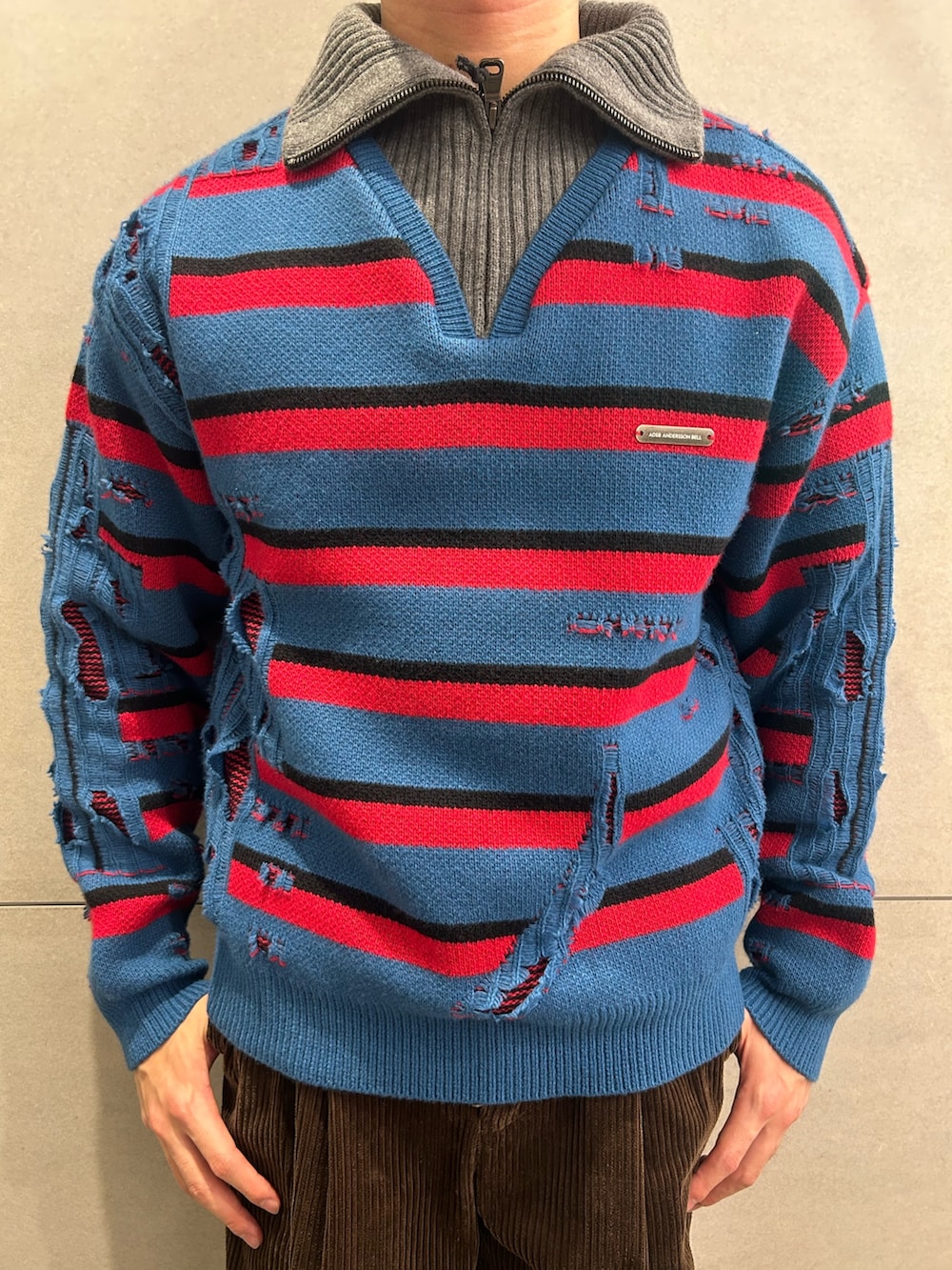 赤と青のボーダーという一見派手そうに見えるニットですが、意外とパンツにも合わせやすくかなり使いやすいアイテムです!