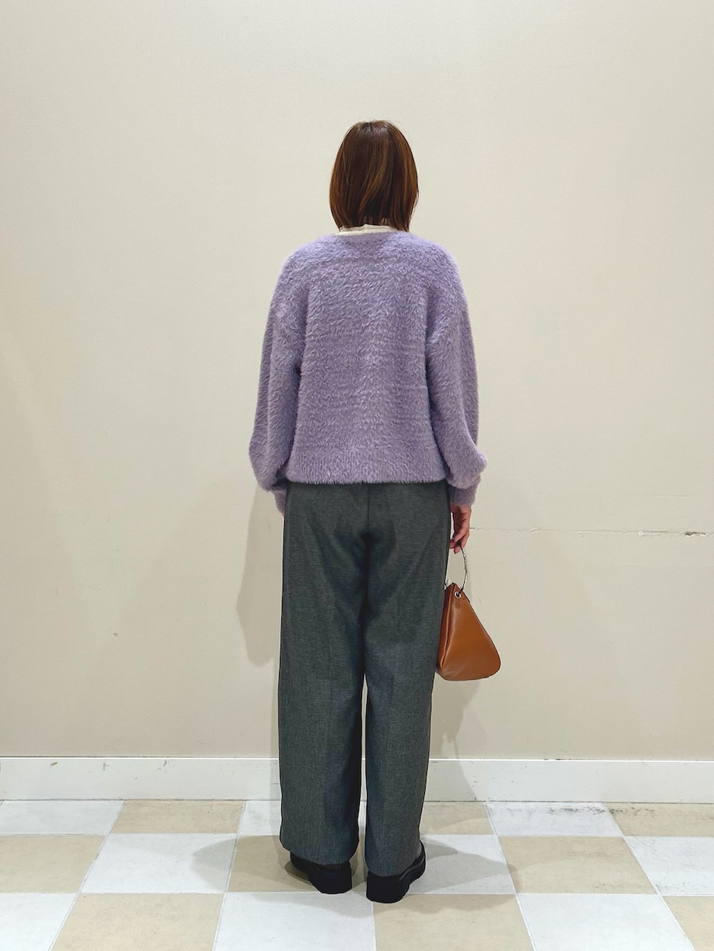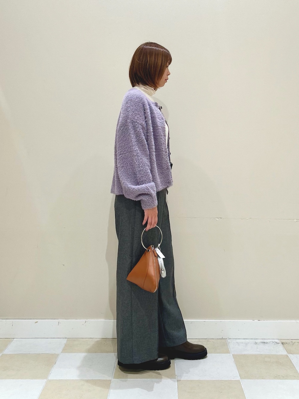 カラーが綺麗なシャギーニットカーディガンにハイネックカットソーとベルト付きのツイードパンツでコーディネートしました!