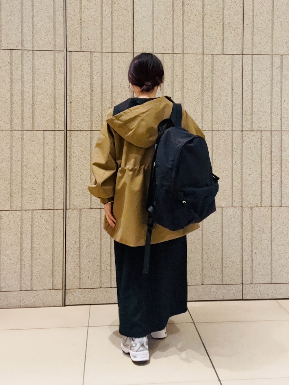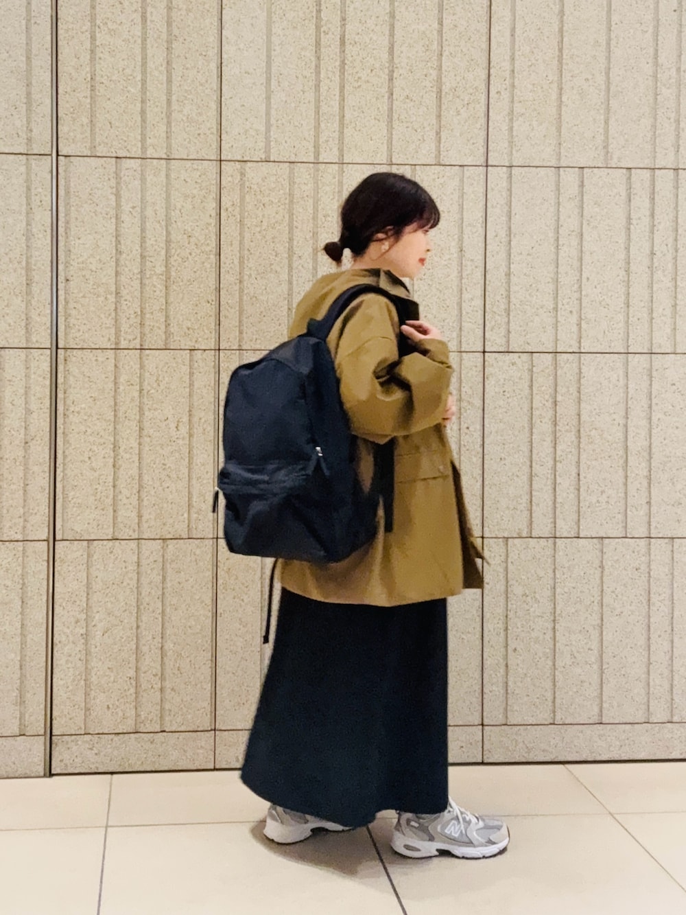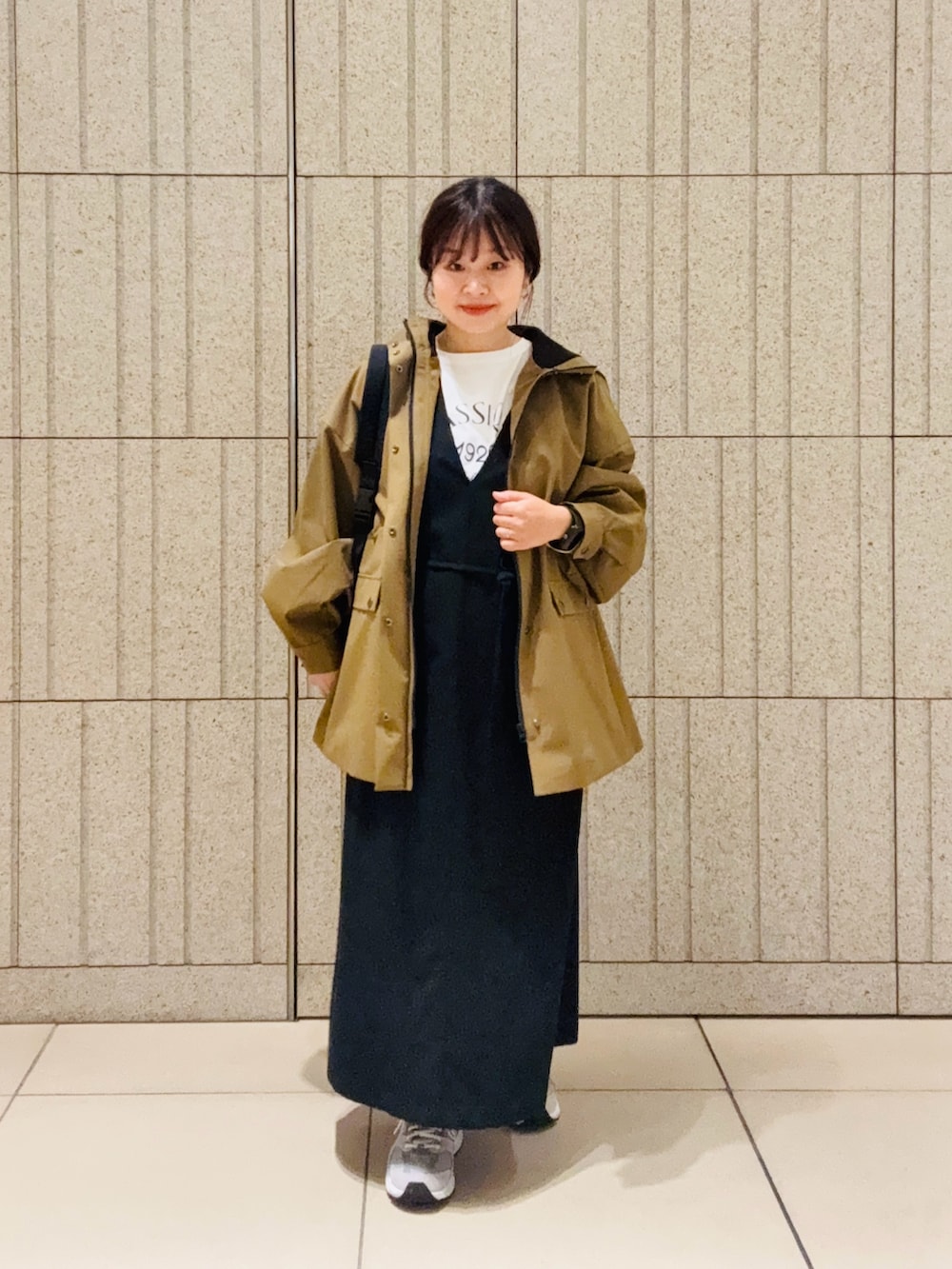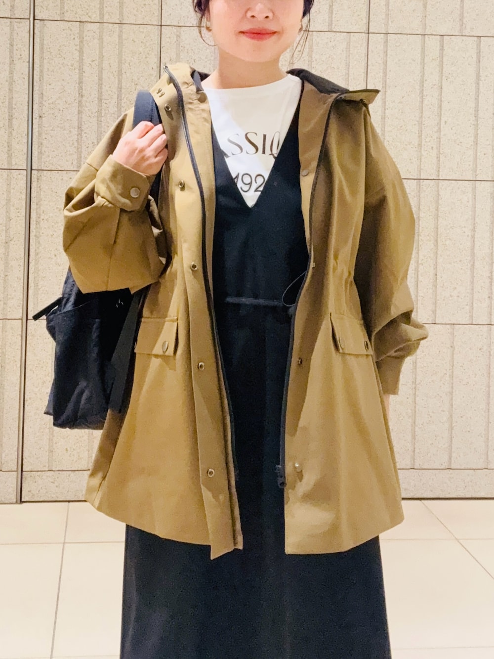 ツイルフレアジャンパースカートと合わせてカジュアルお出かけコーデにしました。アウターはウエストが絞れるのでキレイめなアイテムとも相性良く着回せます。