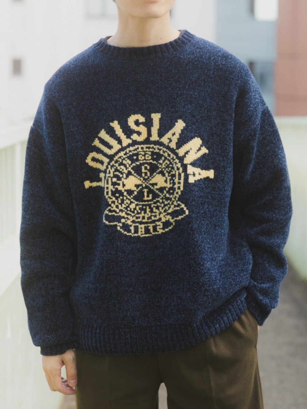 ふっくらと柔らかなモール糸で編み立てた、あたたかみのあるロゴニットです。カレッジロゴが程よい遊び心を添えつつも、落ち着いたカラーリングと立体感のある素材使いで、大人らしいバランスに仕上がっています。