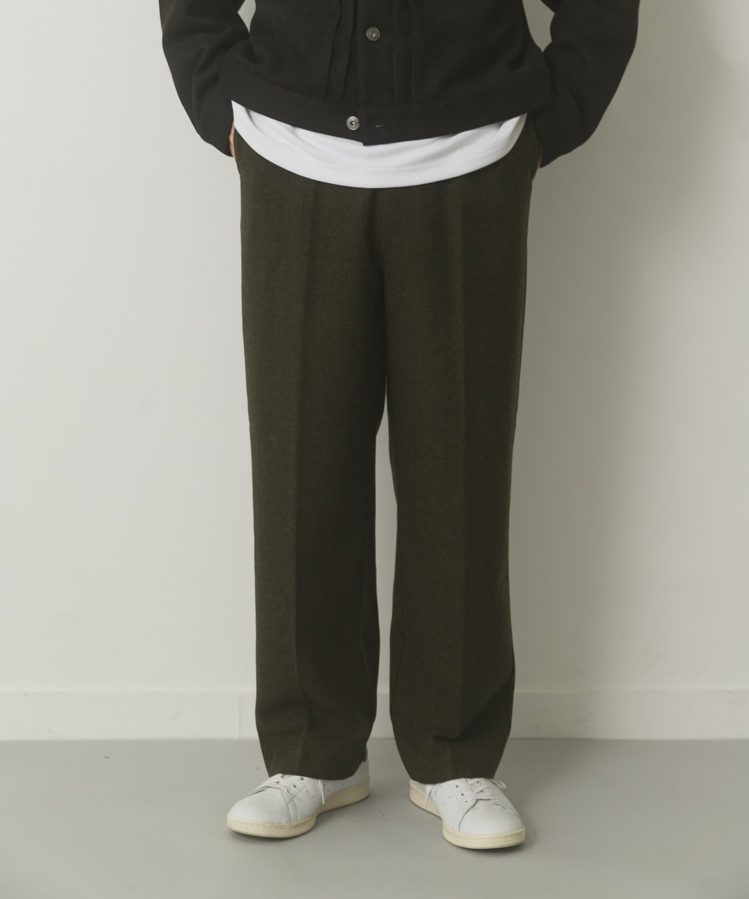 ウール混素材の柔らかな風合いが、落ち着きのある大人の印象を演出するスラックスです。裾に向かって細くなるテーパードシルエットが脚のラインをきれいに見せ、ニットやスウェットなどカジュアルなトップスとも相性抜群。オンオフ問わず取り入れやすく、季節の着こなしを上品にまとめてくれる一本です。