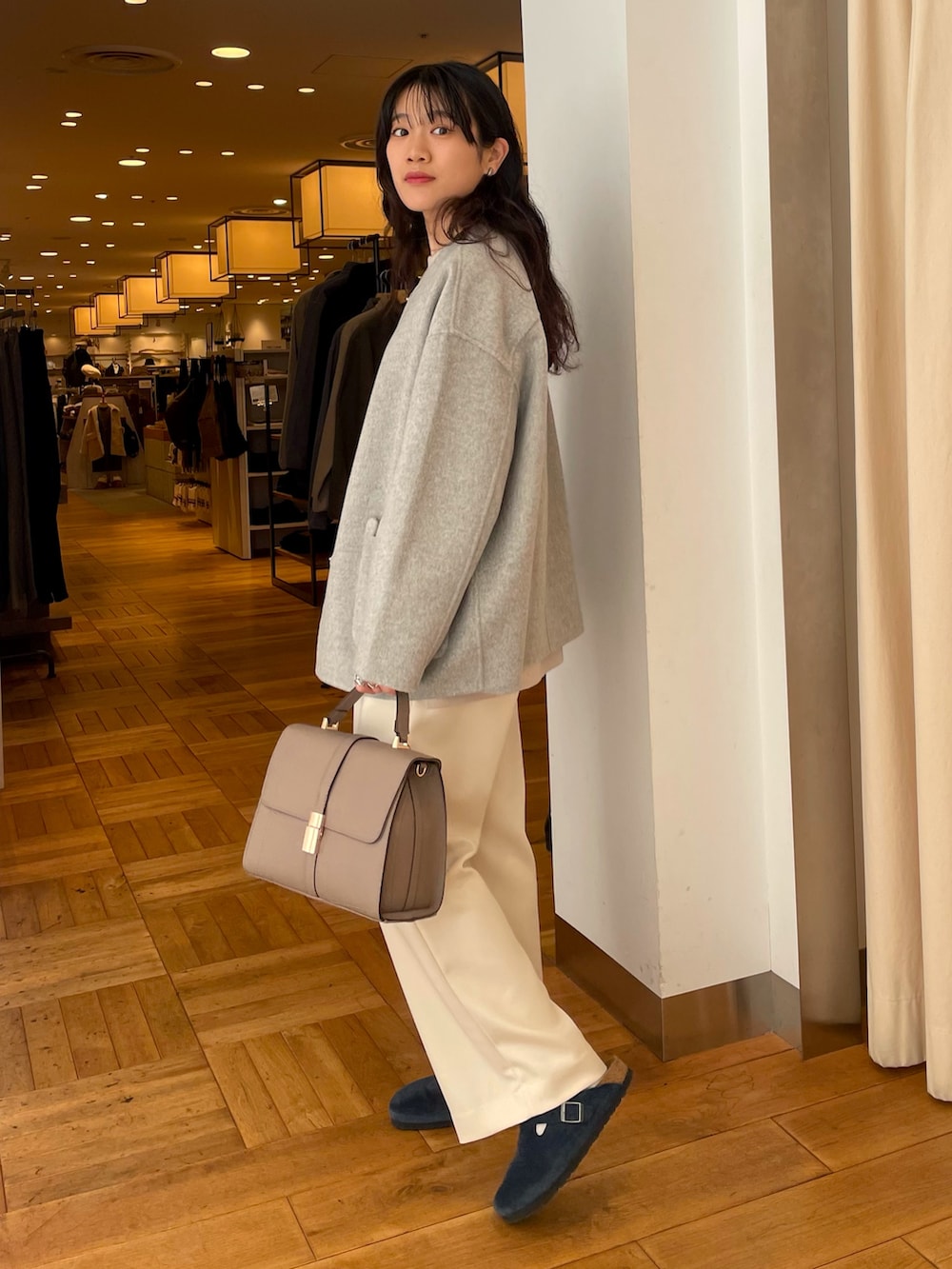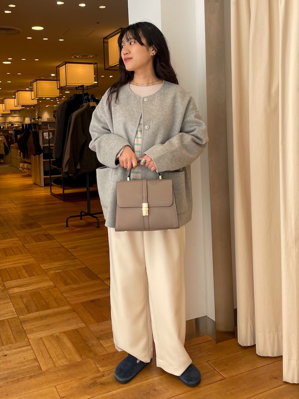 お車に乗る時にも薄手なので脱がなくてもモゴモゴしすぎない厚さが魅力です◎
