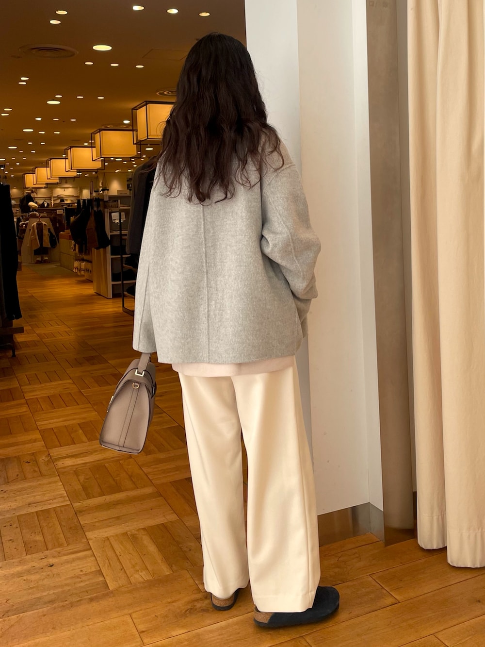 グレーのウールリバーコートが薄手で