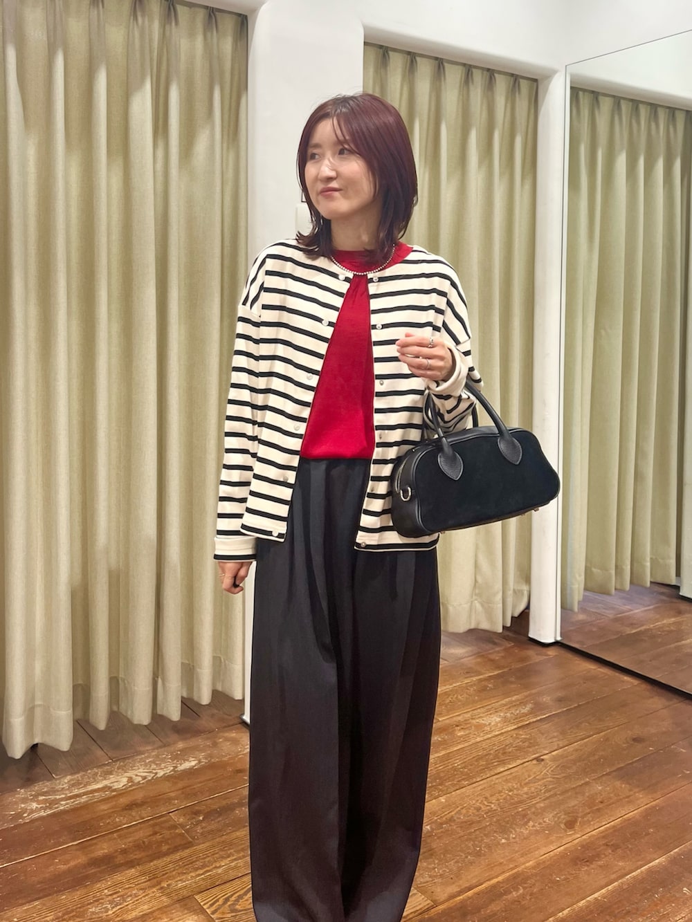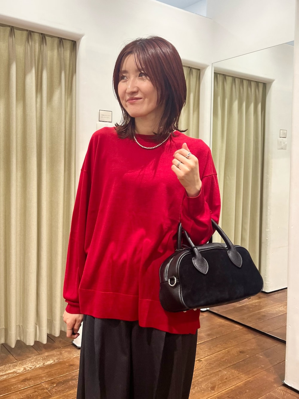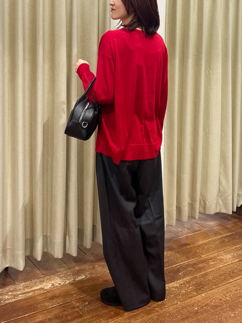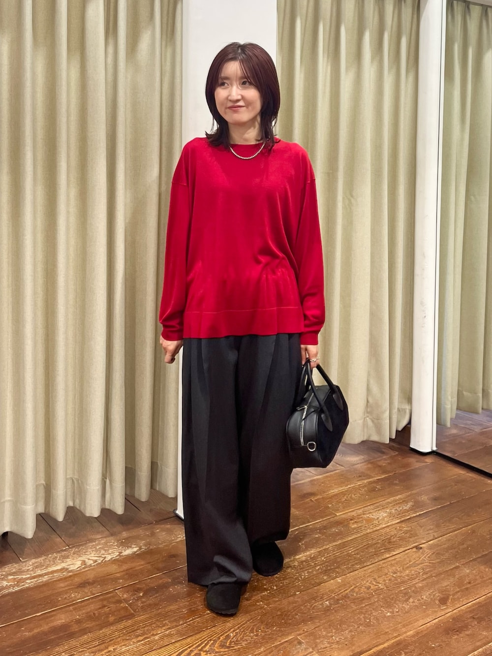 トップスは赤のカラーが上品でコーディネートのポイントになります✨シルク混ですが手洗いも可能なのでケアが楽なのも嬉しいですよね!