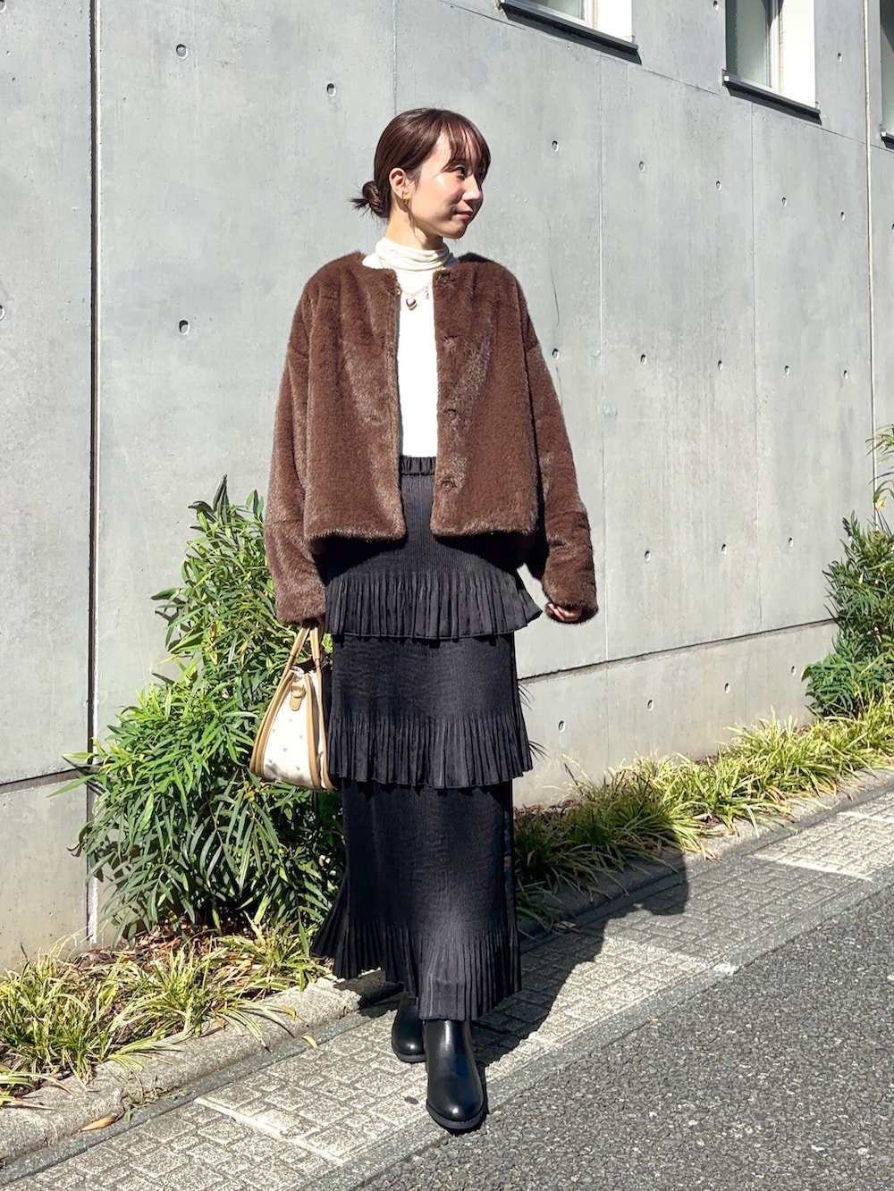 ファーブルゾンにティアードスカートを合わせてキレイめな大人フェミニンなコーデに仕上げてみました🩶