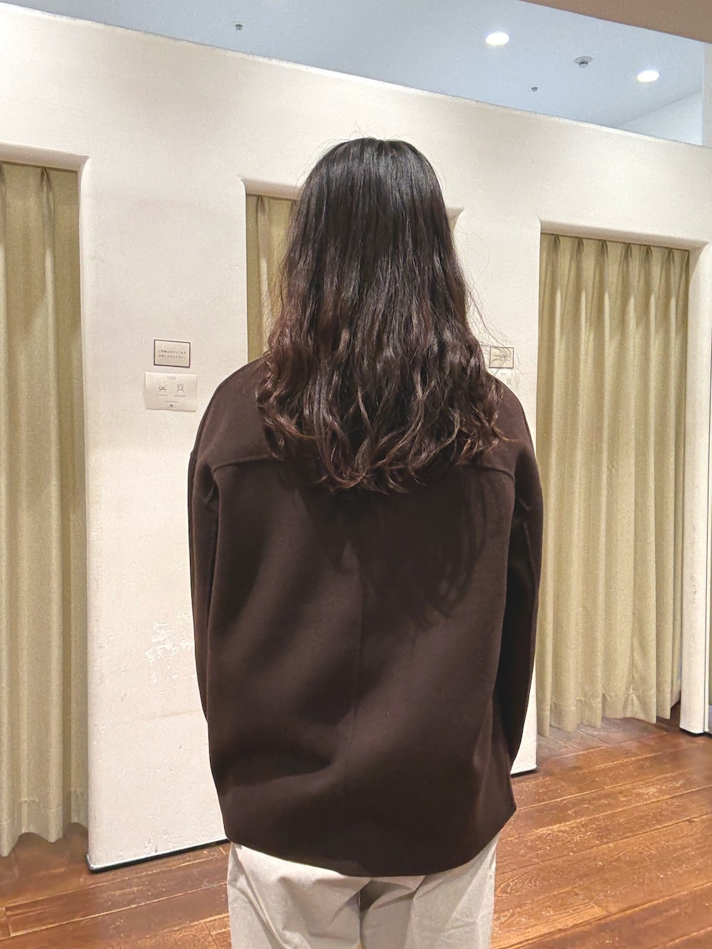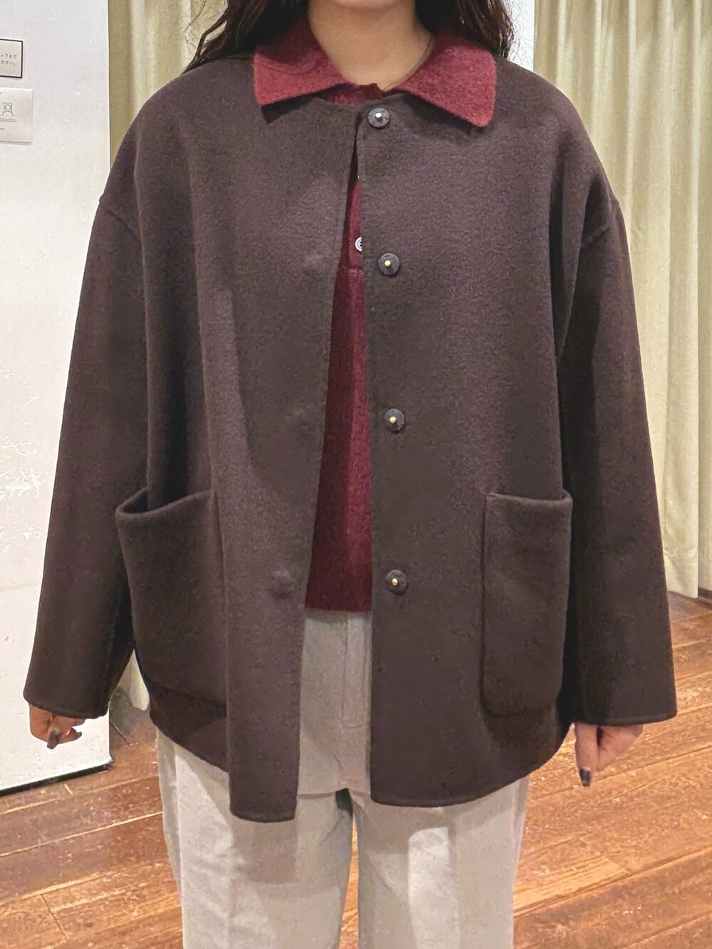 コートはノーカラーで身幅も大きすぎず、首元がクルーネックなので、顔周りがスッキリ見えします。タートルネックや襟のあるお洋服と一緒に着るのも可愛いです◎