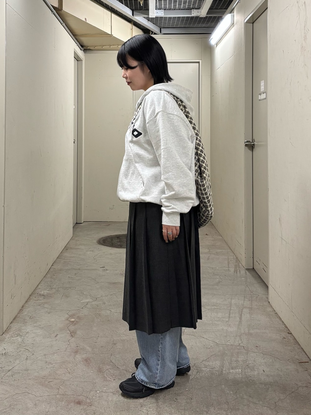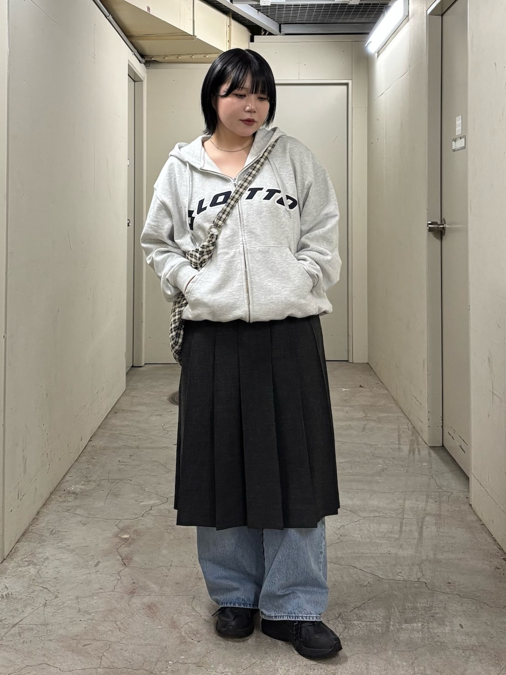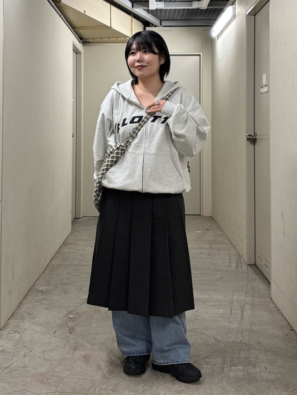 メンズのアイテムなのでオーバーサイズなのですが、ジップを少し広めに開けて首元をスッキリ見せたり、裾を内側に折り込んでシルエットを短くしたりと工夫することで骨格ストレートさんでも問題なく着ていただけますよ👍🏻