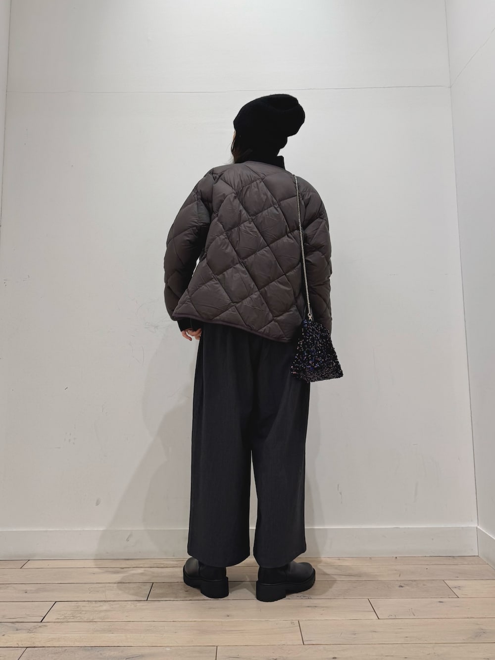 定番のキルトダウン、少しマットな表面がカジュアルになりすぎずきれいめコーデにも馴染みます◎