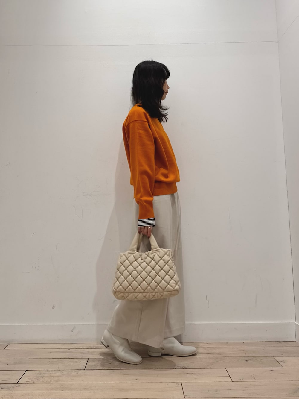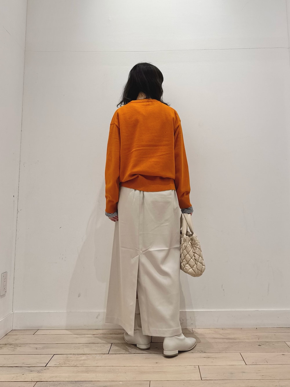 スカートはウールライクで季節感がありつつもイージーケアな嬉しいアイテムです!ウエストもゴムなので楽ちんです◎