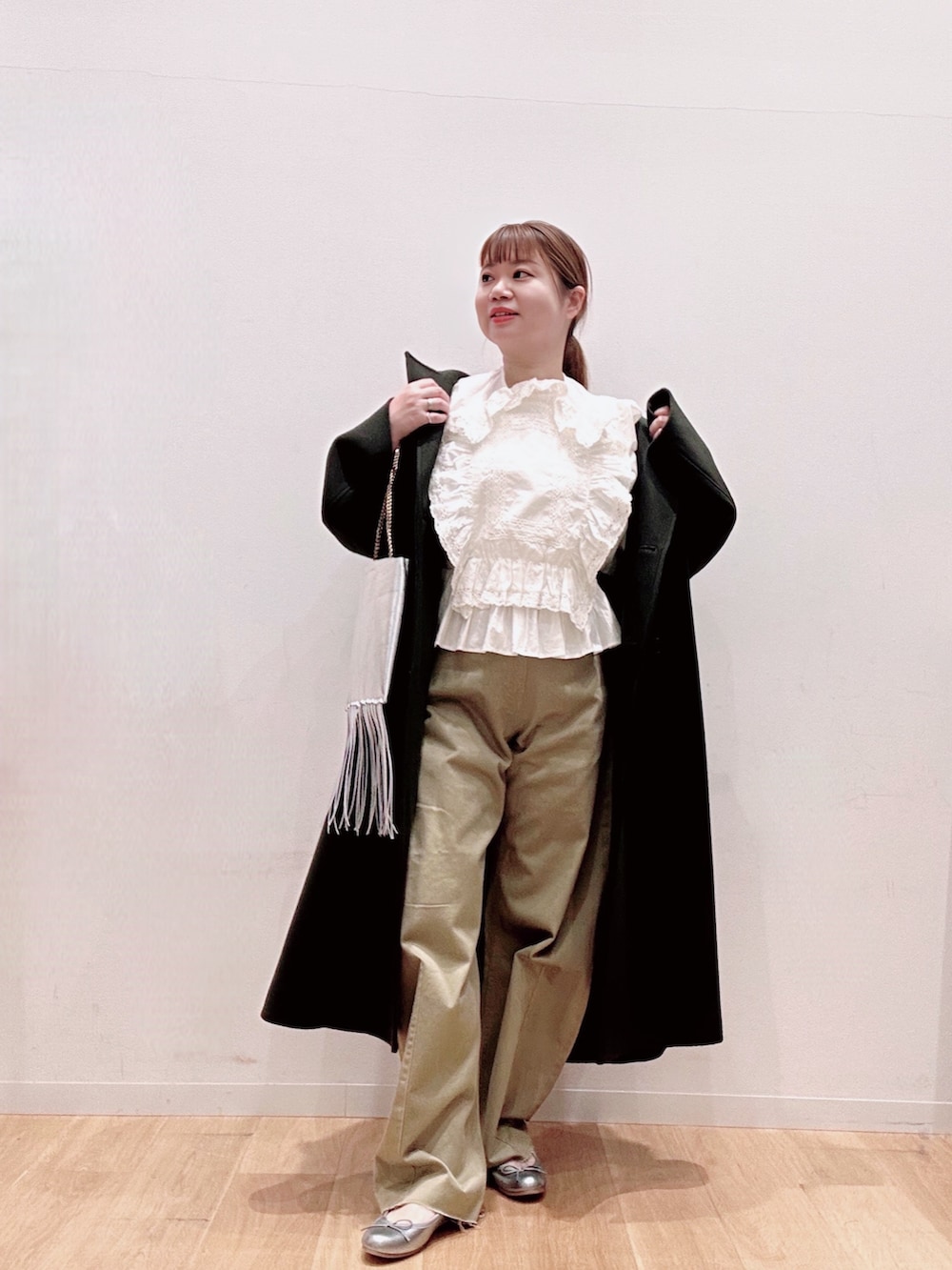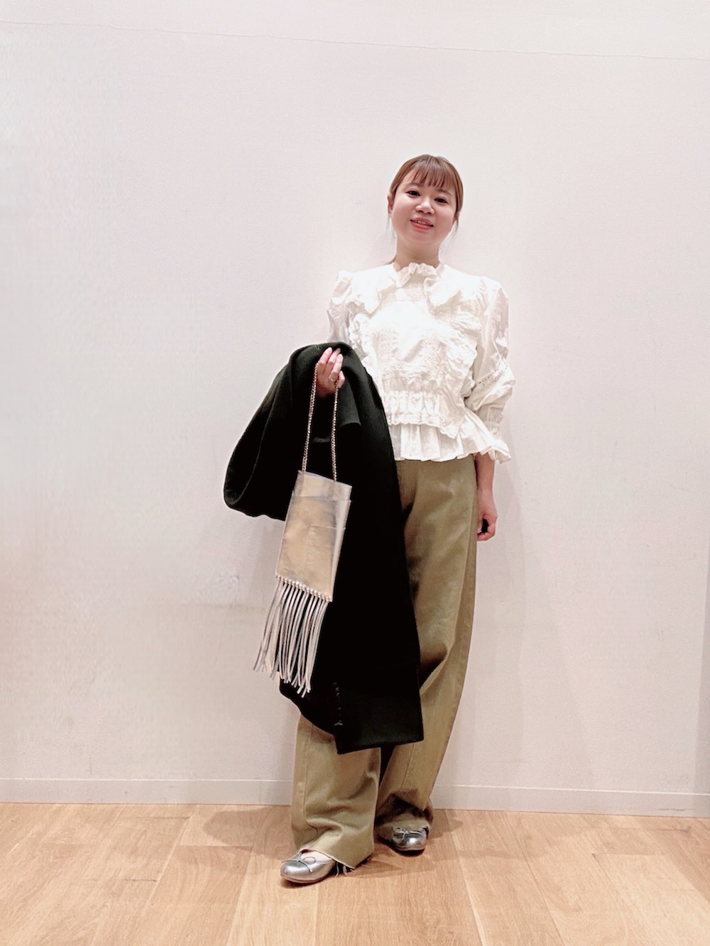 インナーにはフリルたっぷりのブラウスとSALEになったカーブパンツで大人カジュアルに🧑🌟