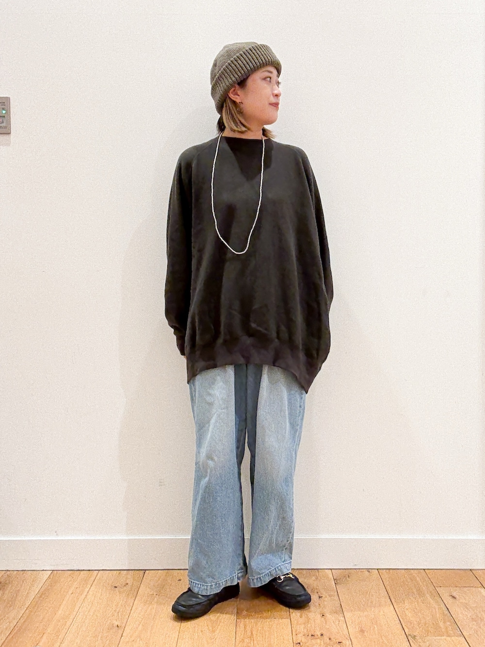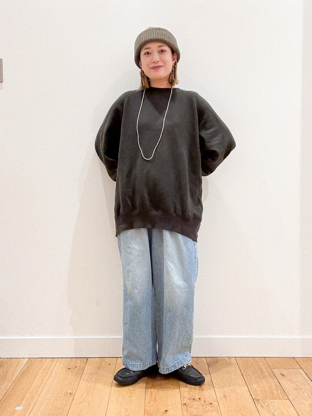 フェードデニムにスウェット合わせでカジュアルなコーディネートに。
