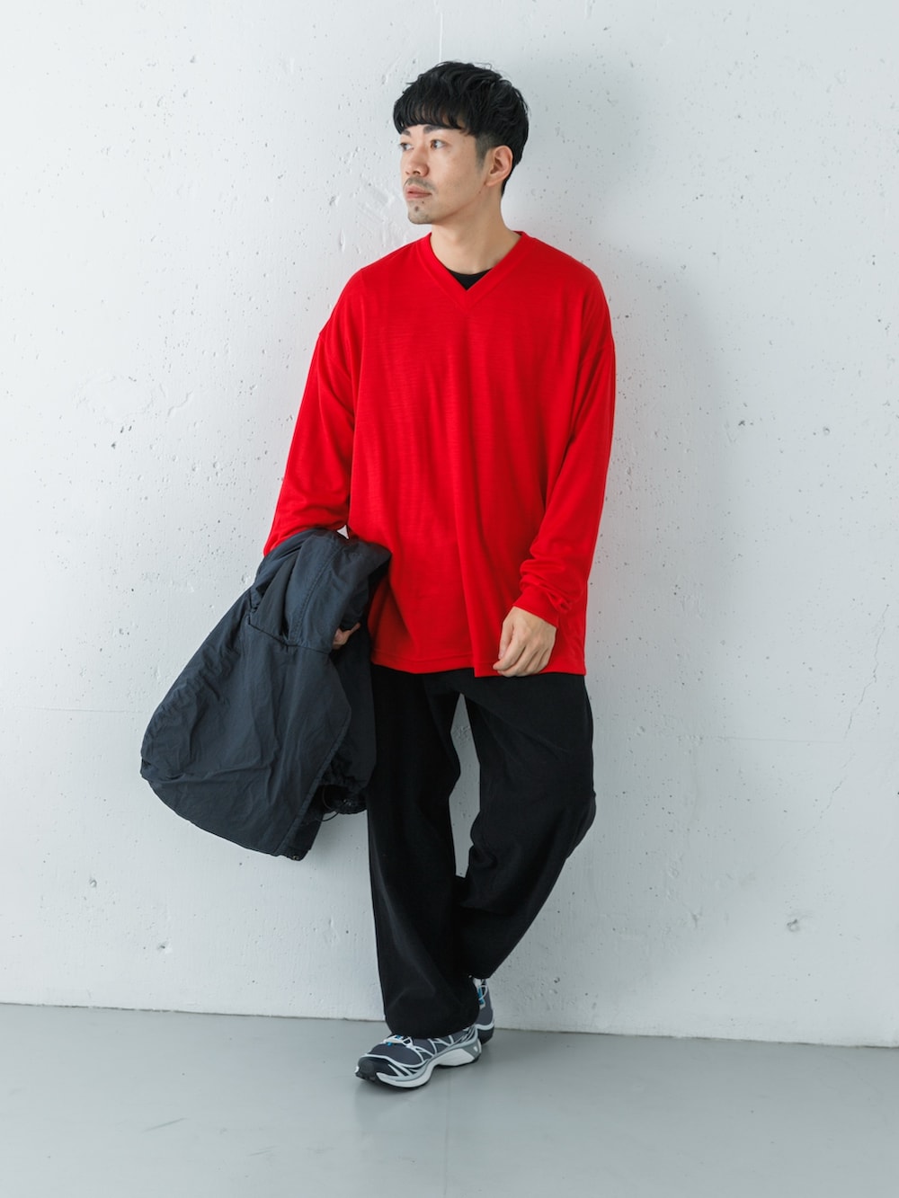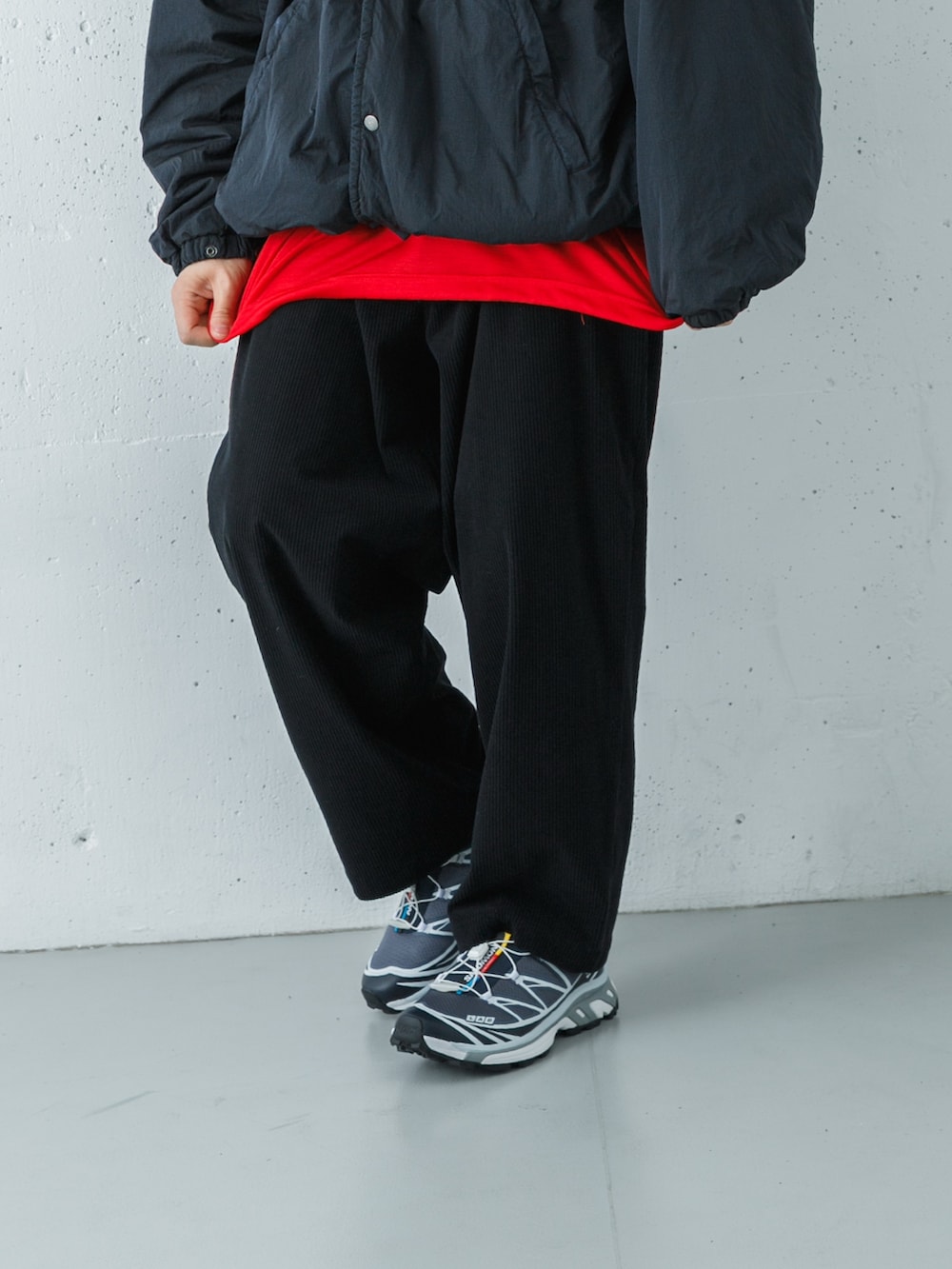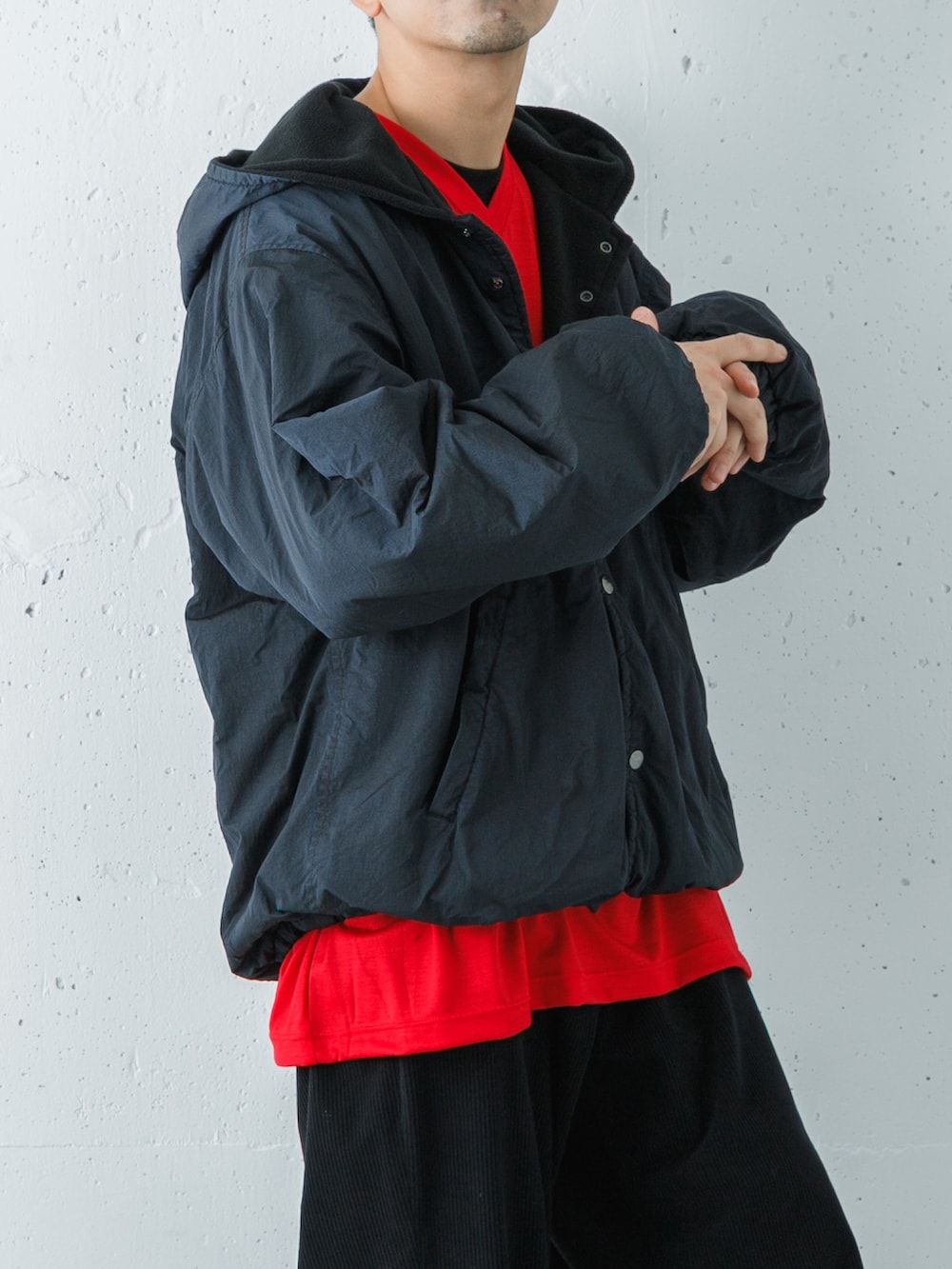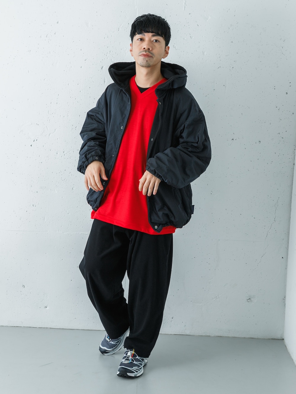 パーカーは大きめの2のサイズを選んで裾をしっかり絞って大胆にインナーの赤色を見せました。