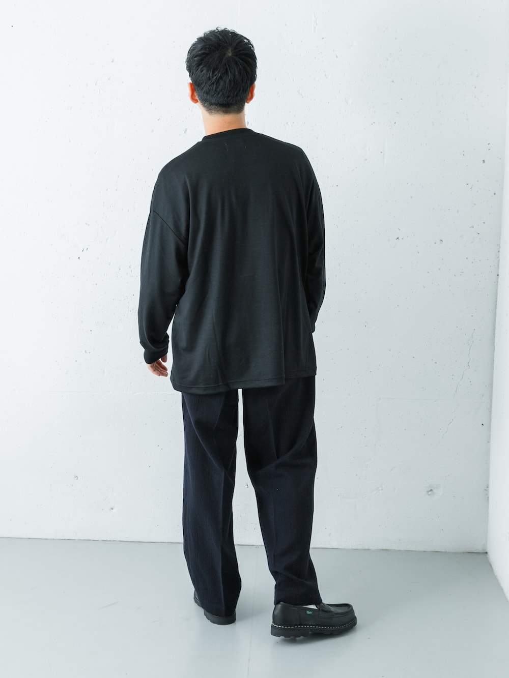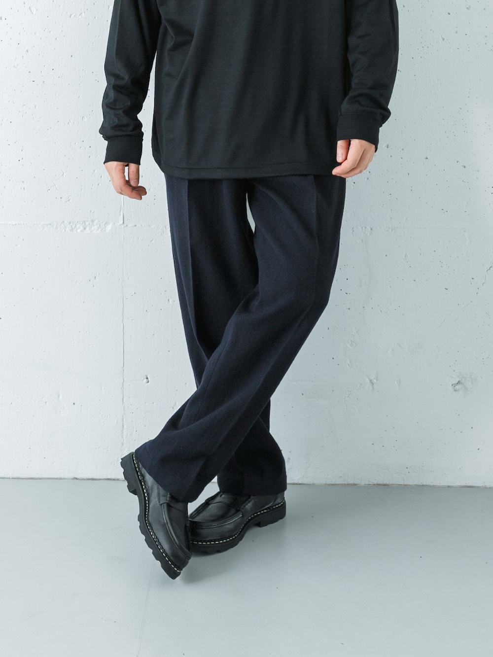 メリノウールのキレイな素材感とスラックスでキレイな印象にしながらサイズ感はゆったりでシンプルでオシャレな印象にしました。