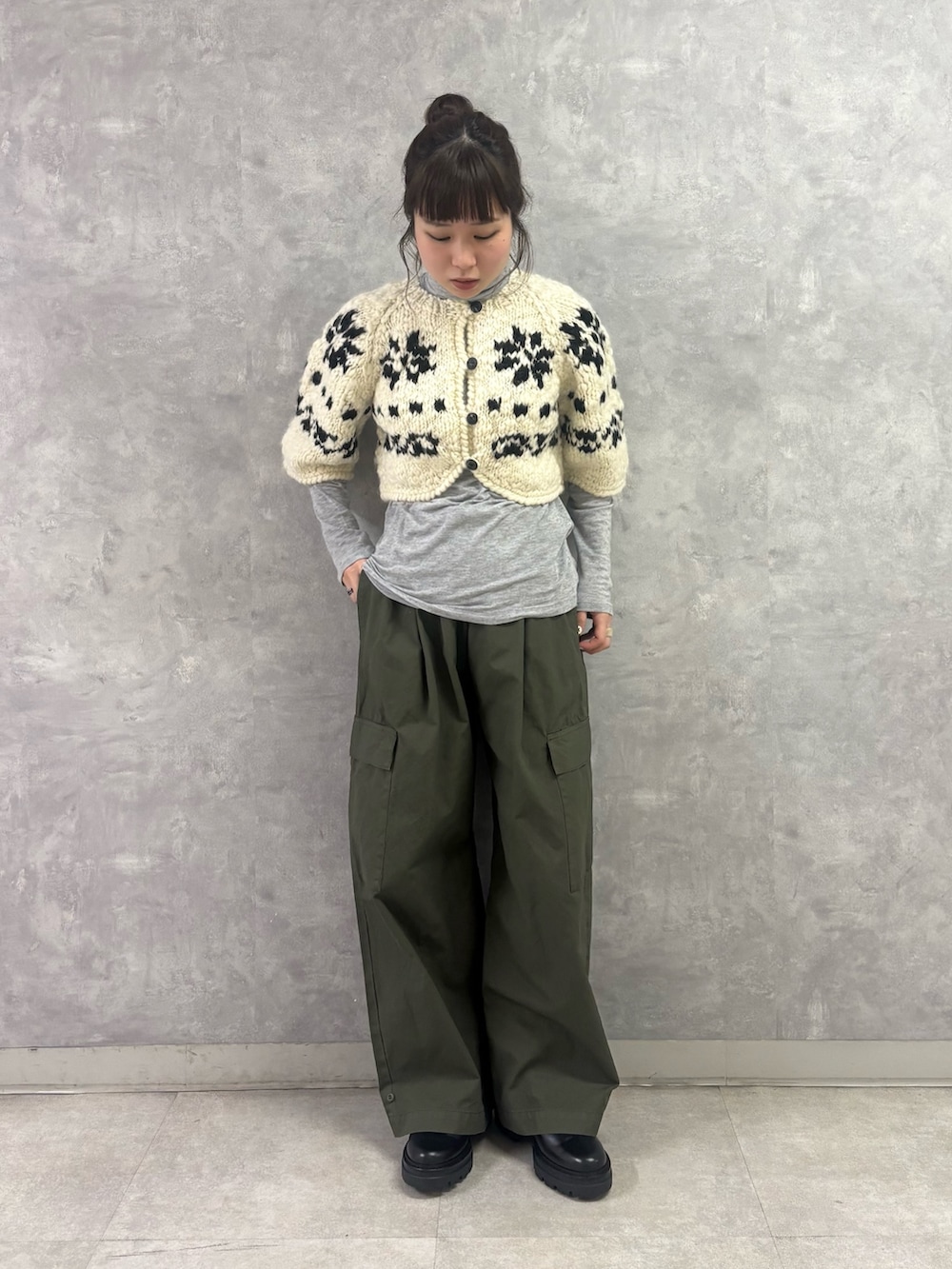 ボトムスにはカーキのカーゴパンツをチョイス。カーディガンの可愛いノルディック柄が持つフェミニン且つ古着っぽい雰囲気×ミリタリーテイストで、個人的に好きなスタイルを組んでみました❄️