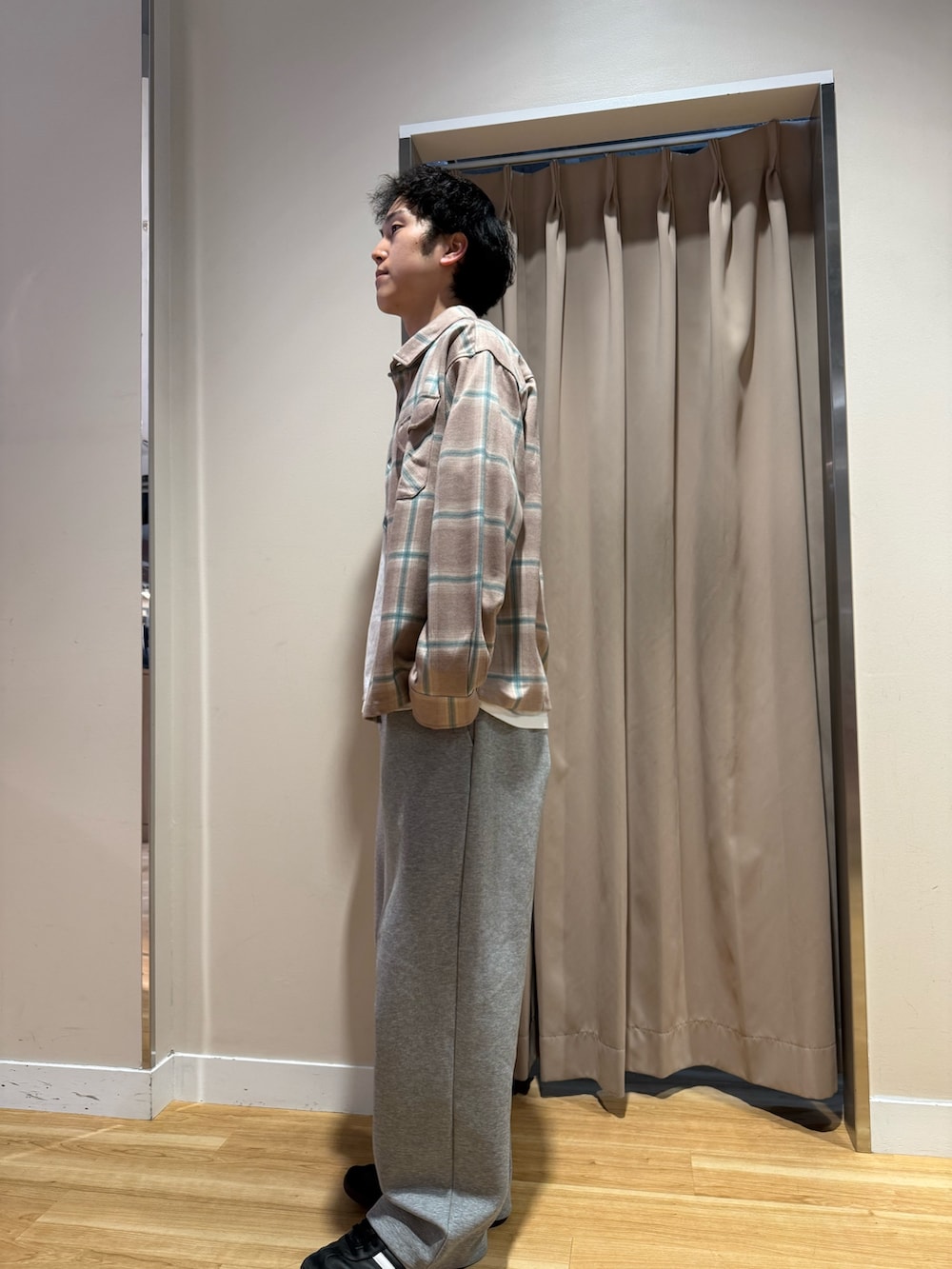 オンブレチェックシャツにスウェットパンツ合わせのラフコーデ!