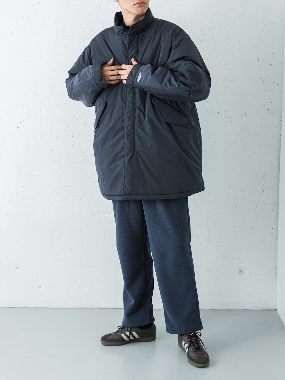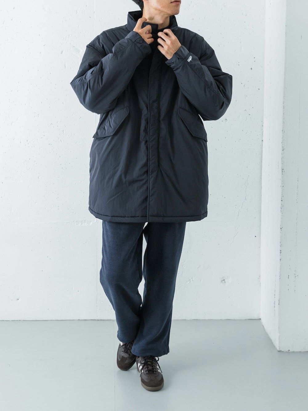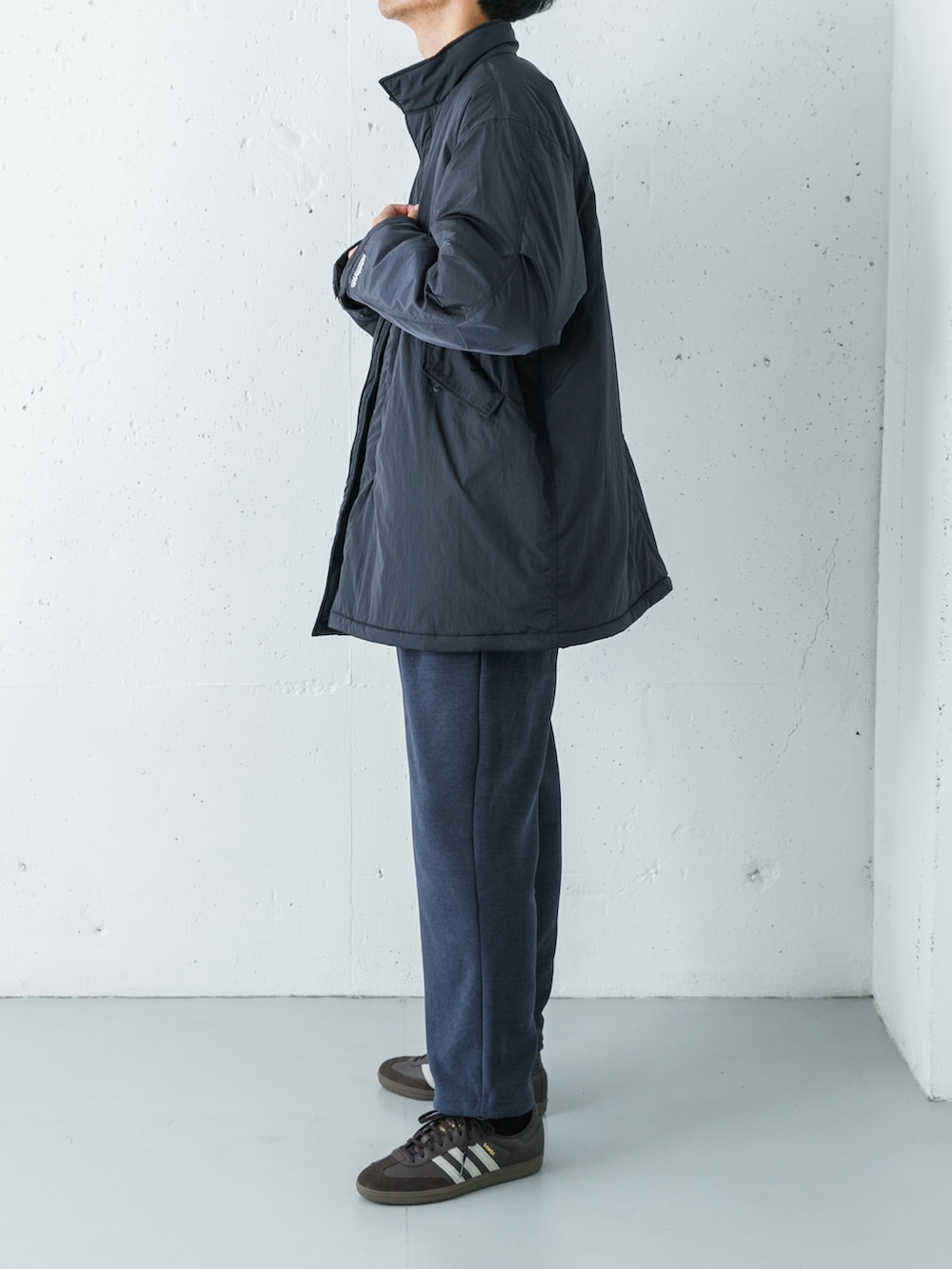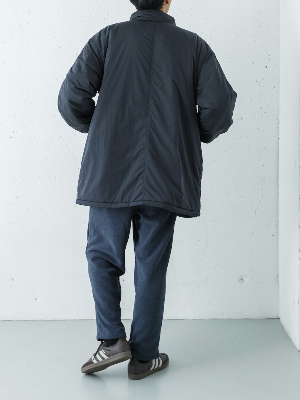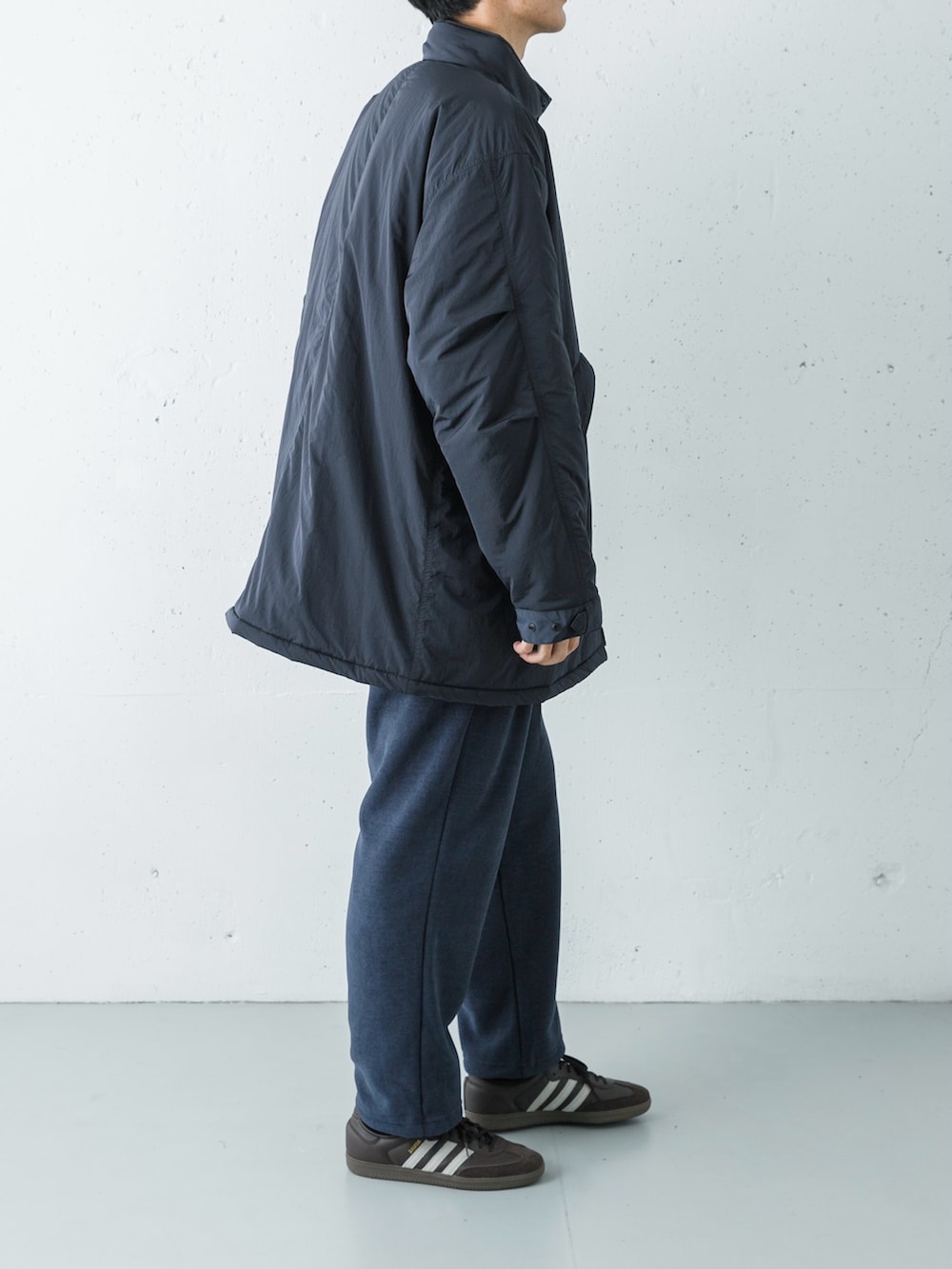 足元には別注のサンバを選び、カジュアルな着こなしに都会的な軽快さと洗練された印象をプラスしました。