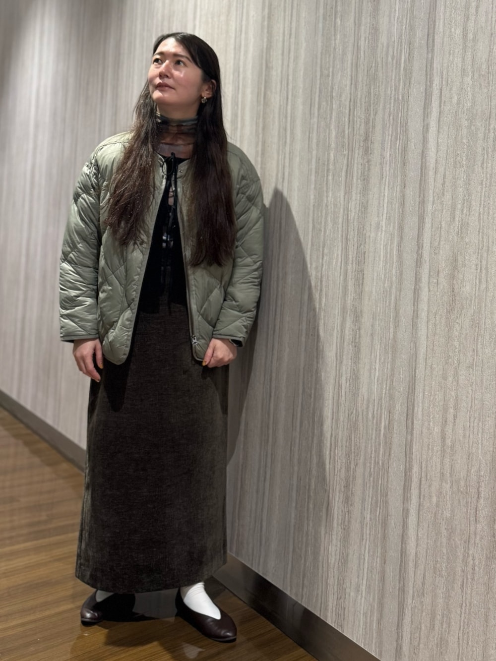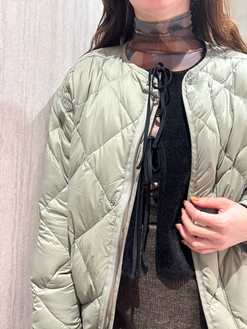 ドロップショルダーのルーズなシルエットが女性らしい抜け感を演出し、光沢感を抑えたマットな表面がリッチな印象なのでカジュアルダウンしすぎません。
