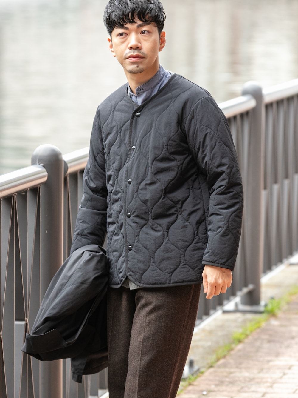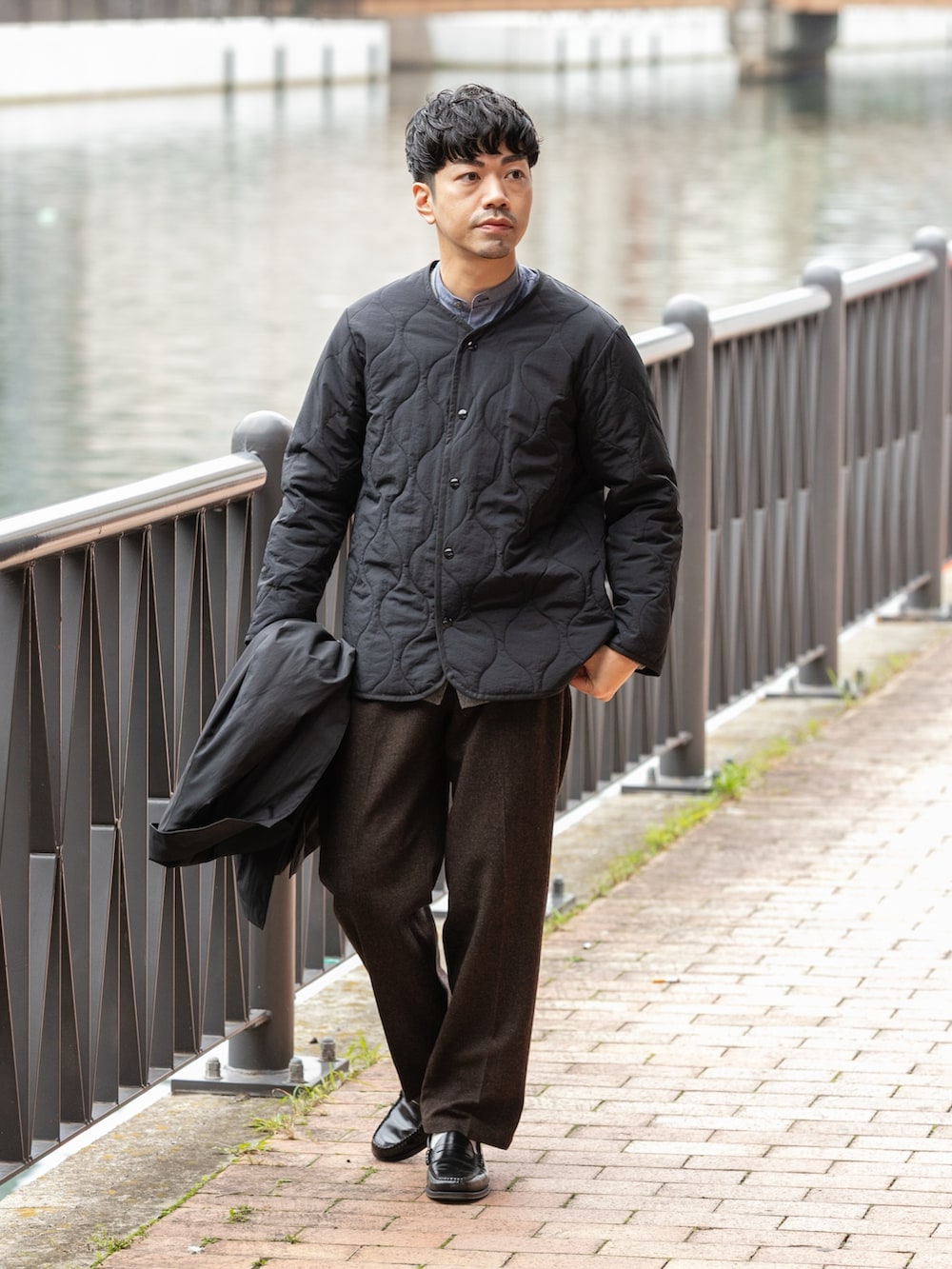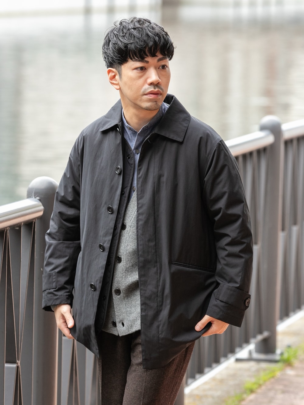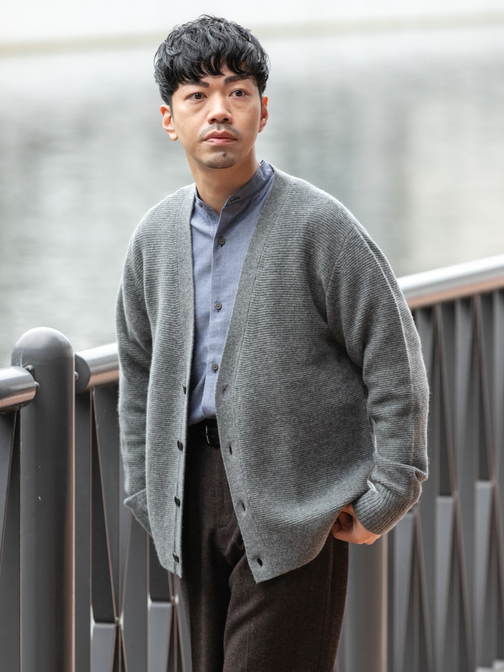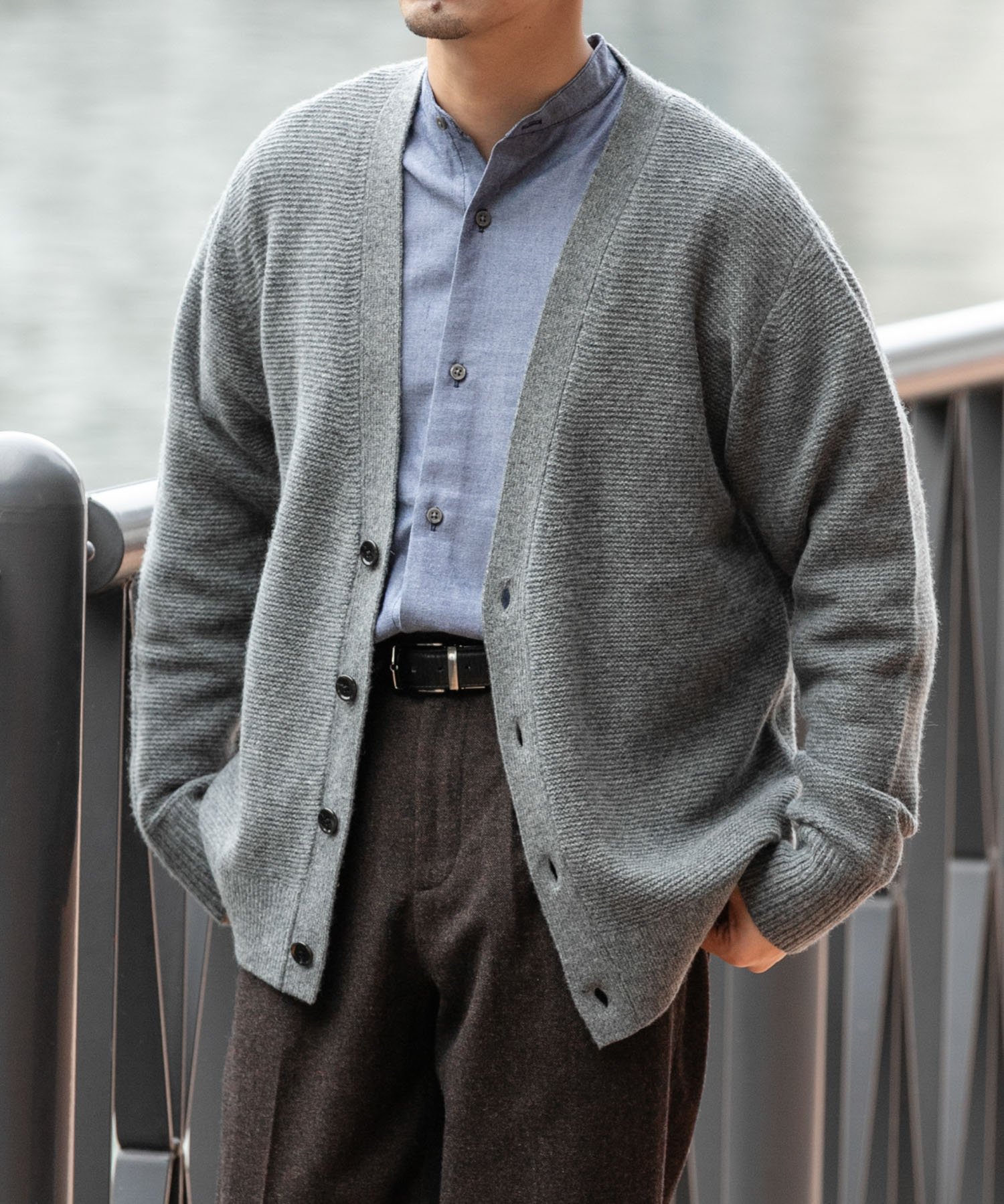 中はネルシャツとカーディガンでキレイな印象にして、パンツは程よいワイドスラックスでカジュアルな印象もプラス。