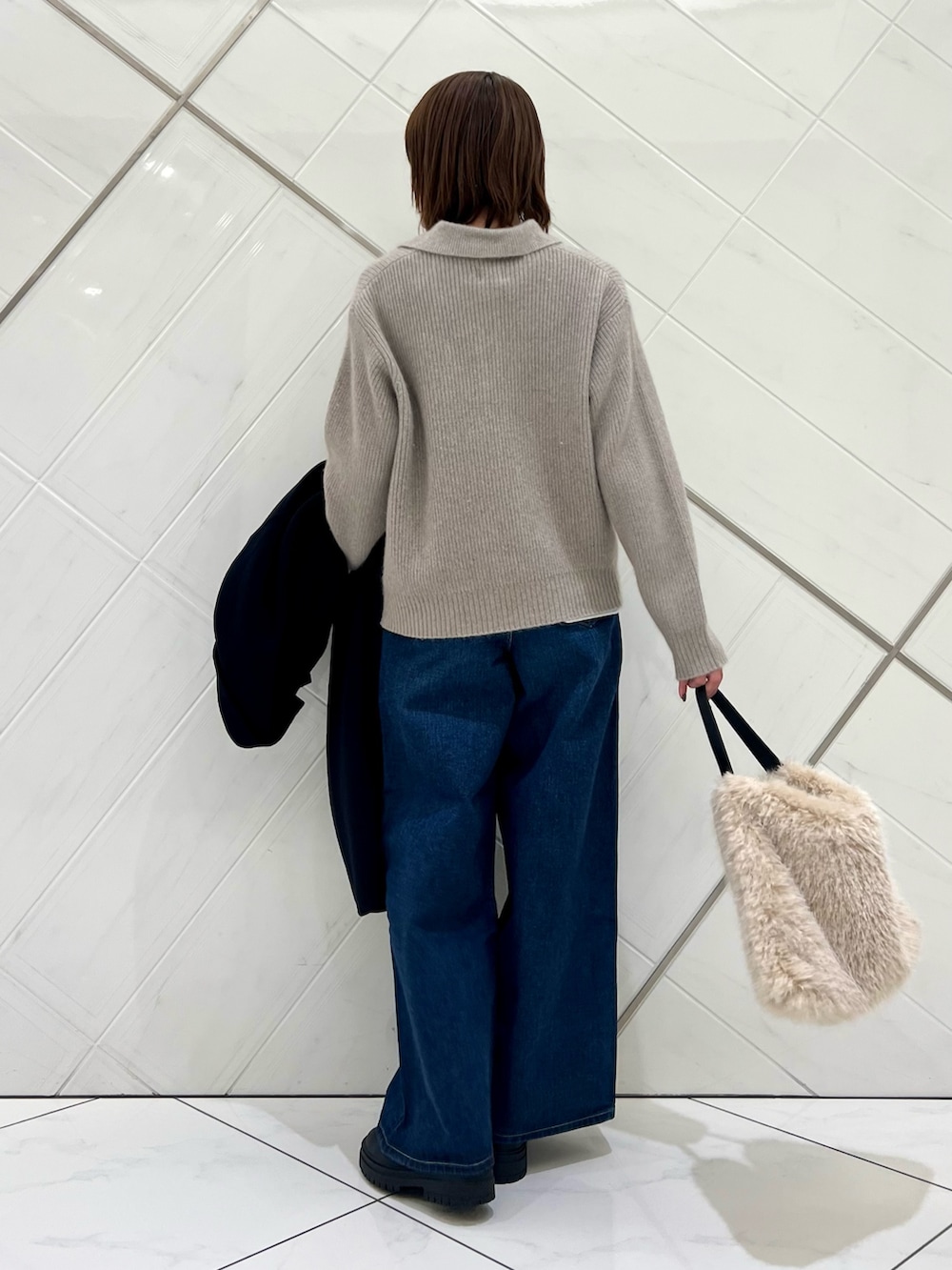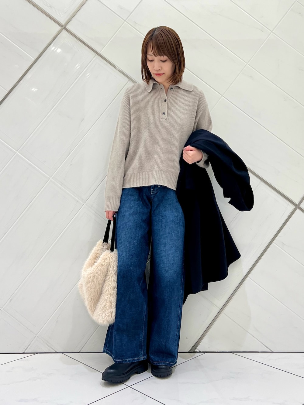 トレンドの襟付きニットはゆったりしたシルエット