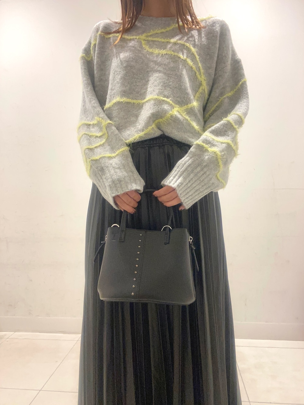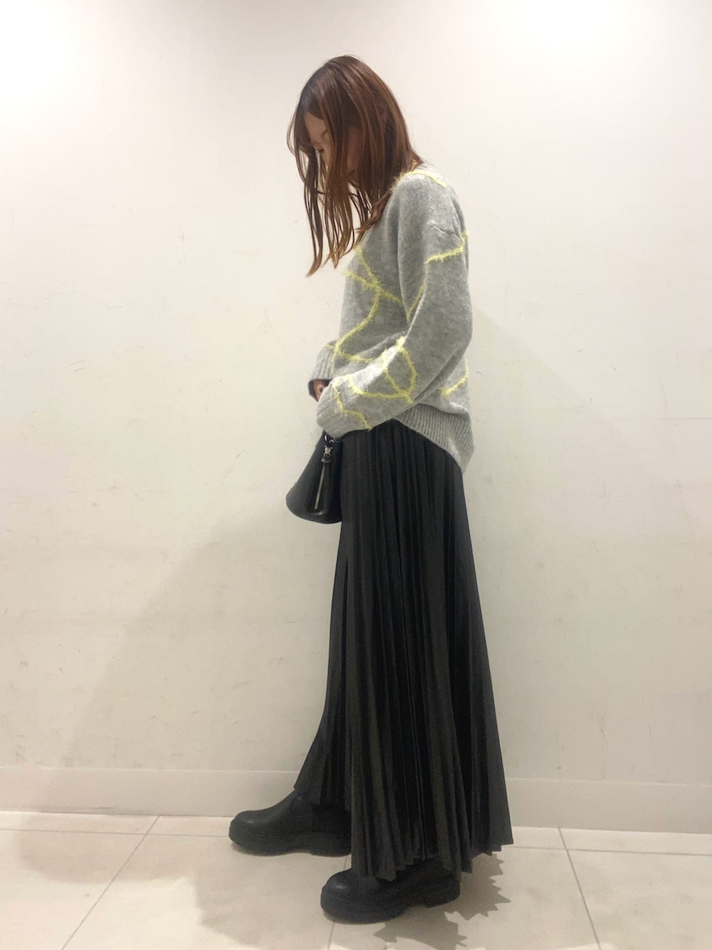 落ち着いたカラーで統一し、ニットの曲線ラインを差し色に!新作のフェイクレザーのスカートはゆったりニットと相性◎動くたび揺れるプリーツがかわいくておすすめです!