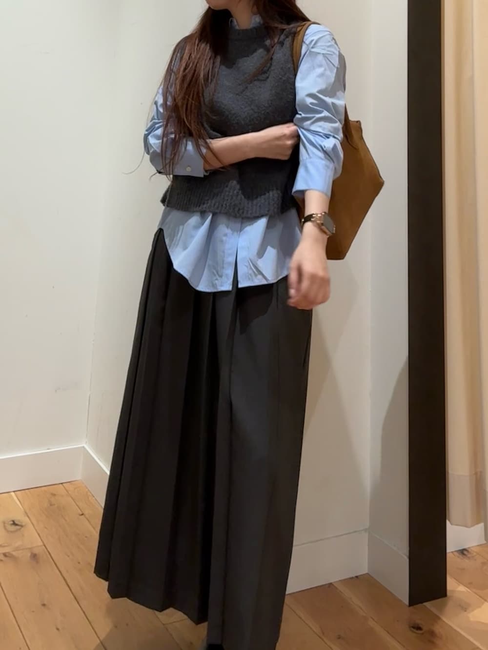 今回はグレーと相性の良いブルーシャツとグレーのロングプリーツスカートと合わせてみました🩶