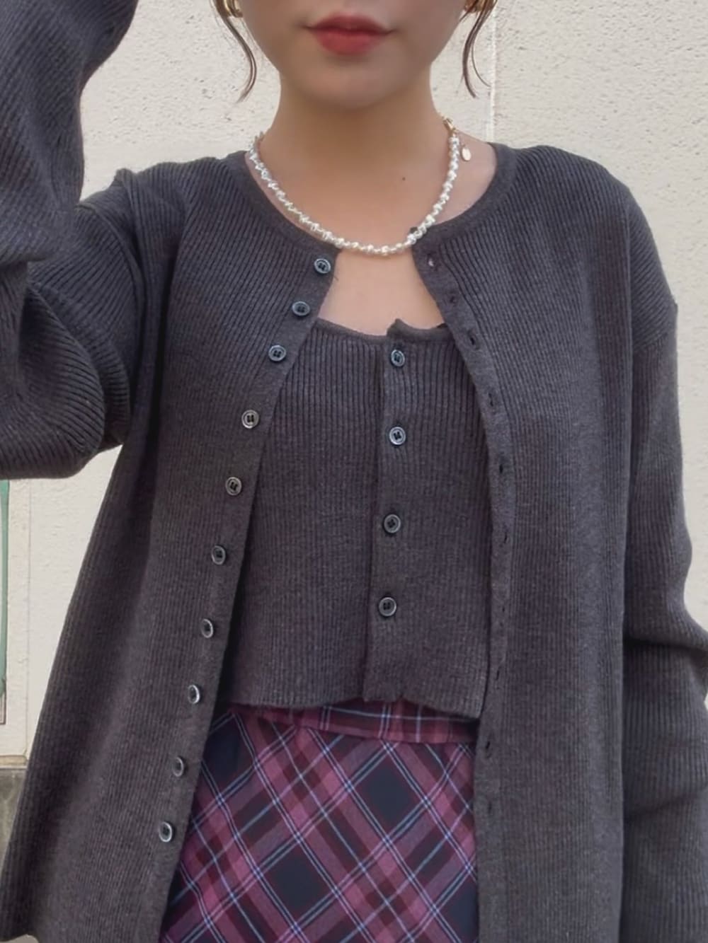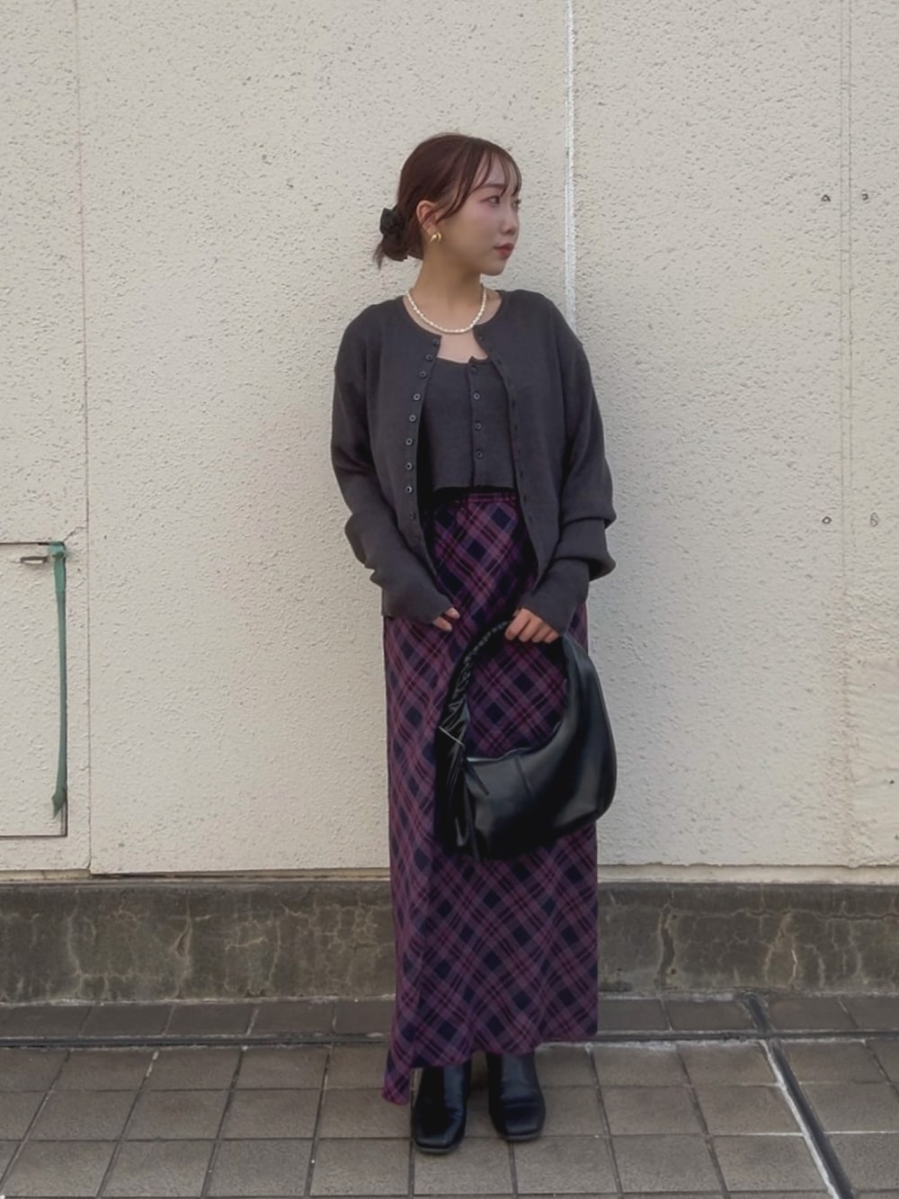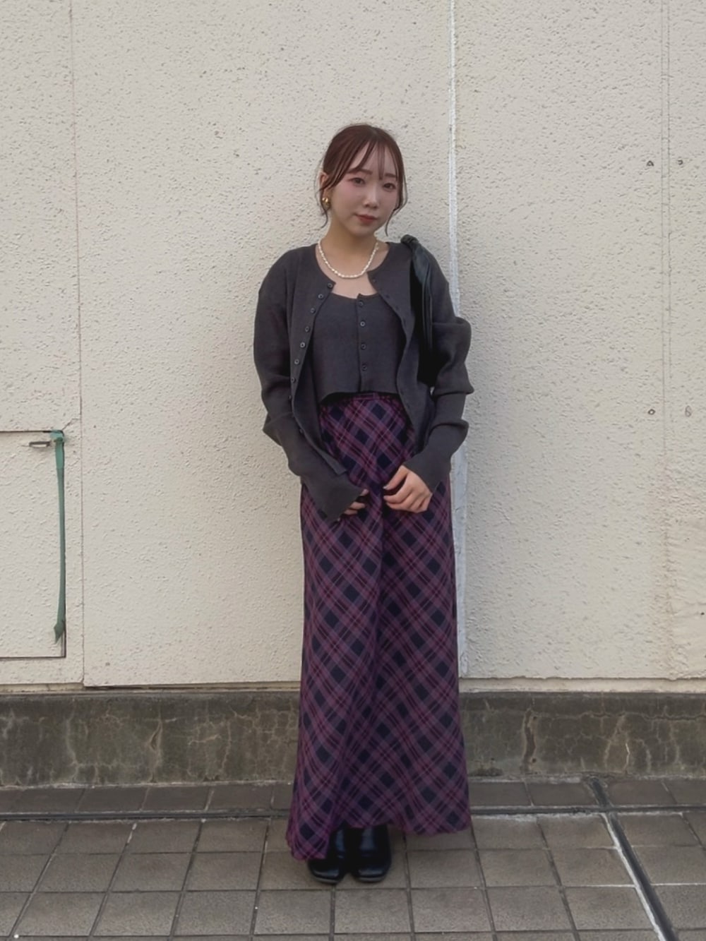赤のチェックスカートで合わせて、秋冬らしいコーディネートにしてみました!