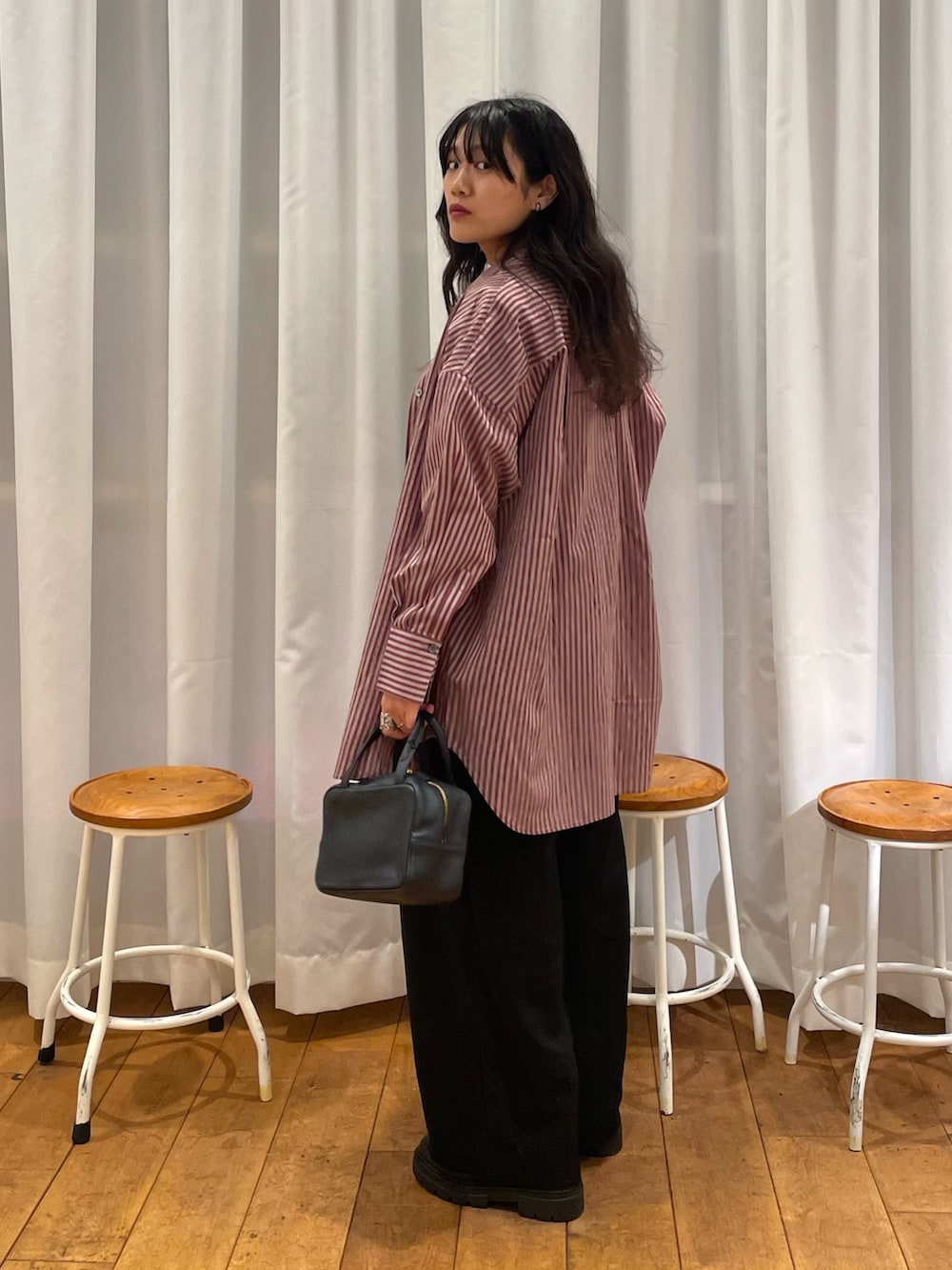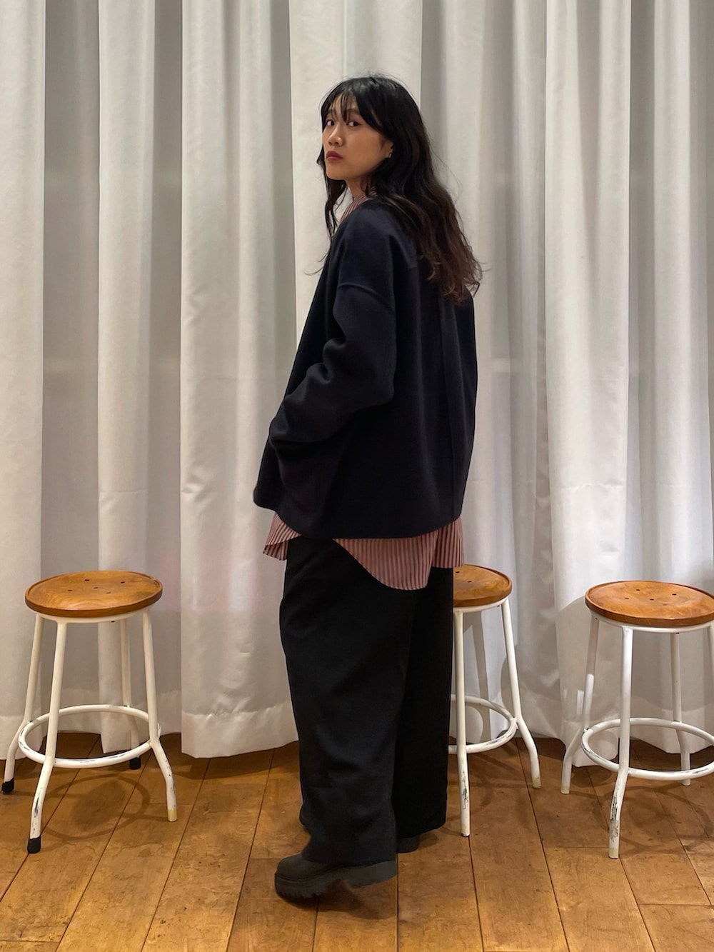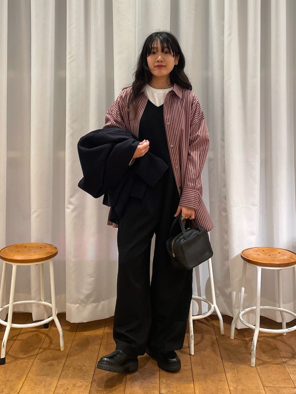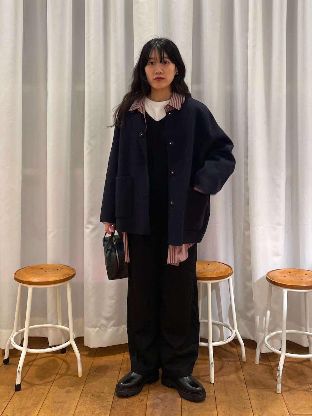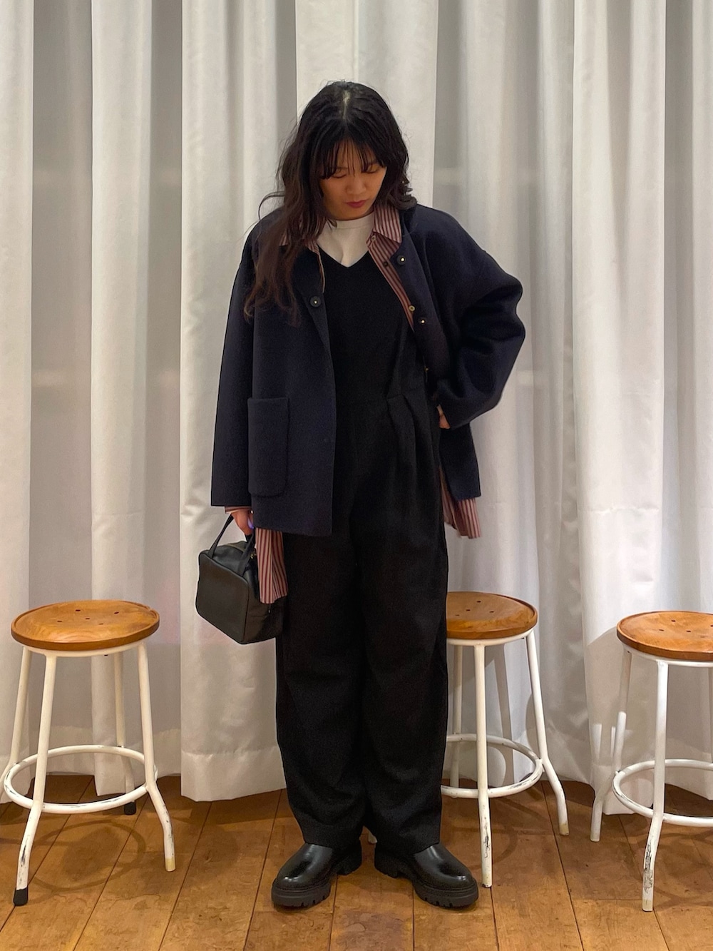 ウールリバーコートからシャツをチラ見せさせた大人のブラックコーデです!