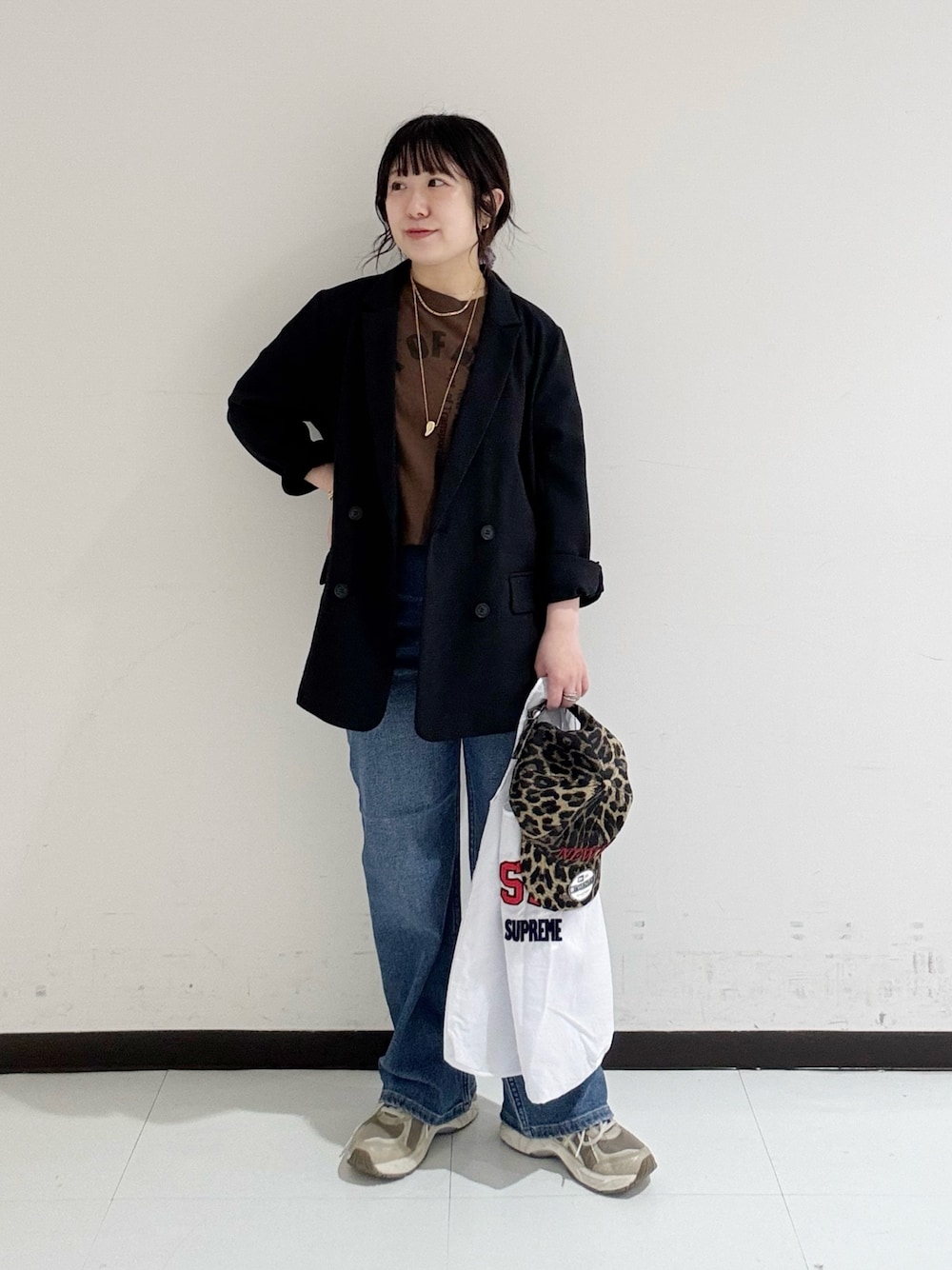ルーズシルエットなので、ボトムはワイドすぎないアイテムを合わせるのがオススメです。