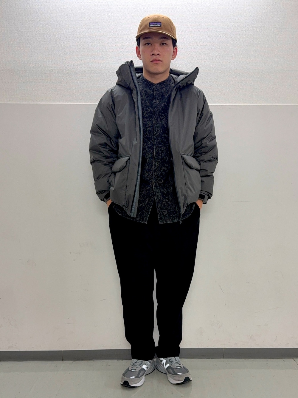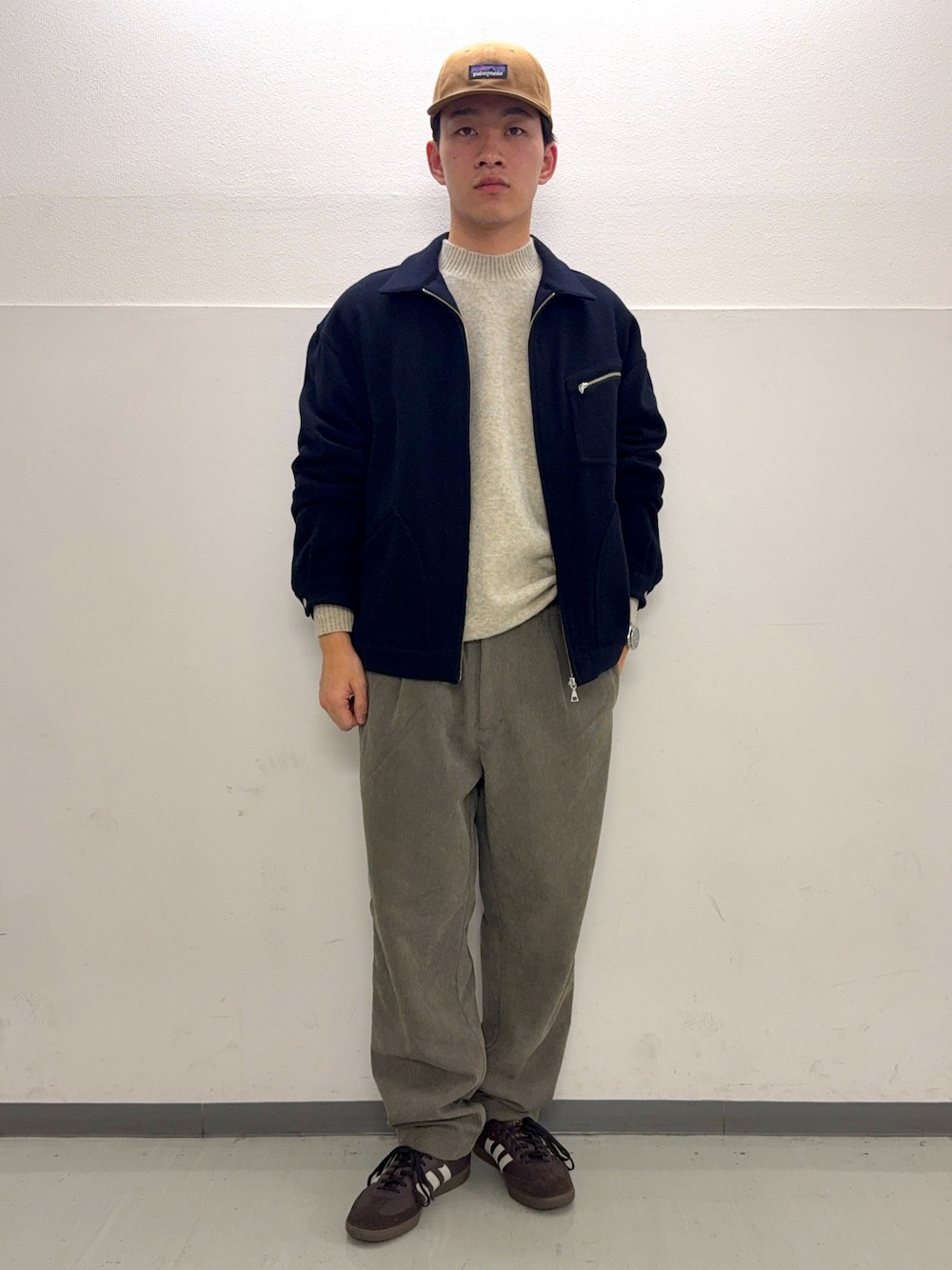 ボトムスには温かみのあるブラウンのコーデュロイパンツを選び、素材で季節感を演出しました。足元はスウェードローファーで、全体のトーンを合わせつつ上品さをキープしています。