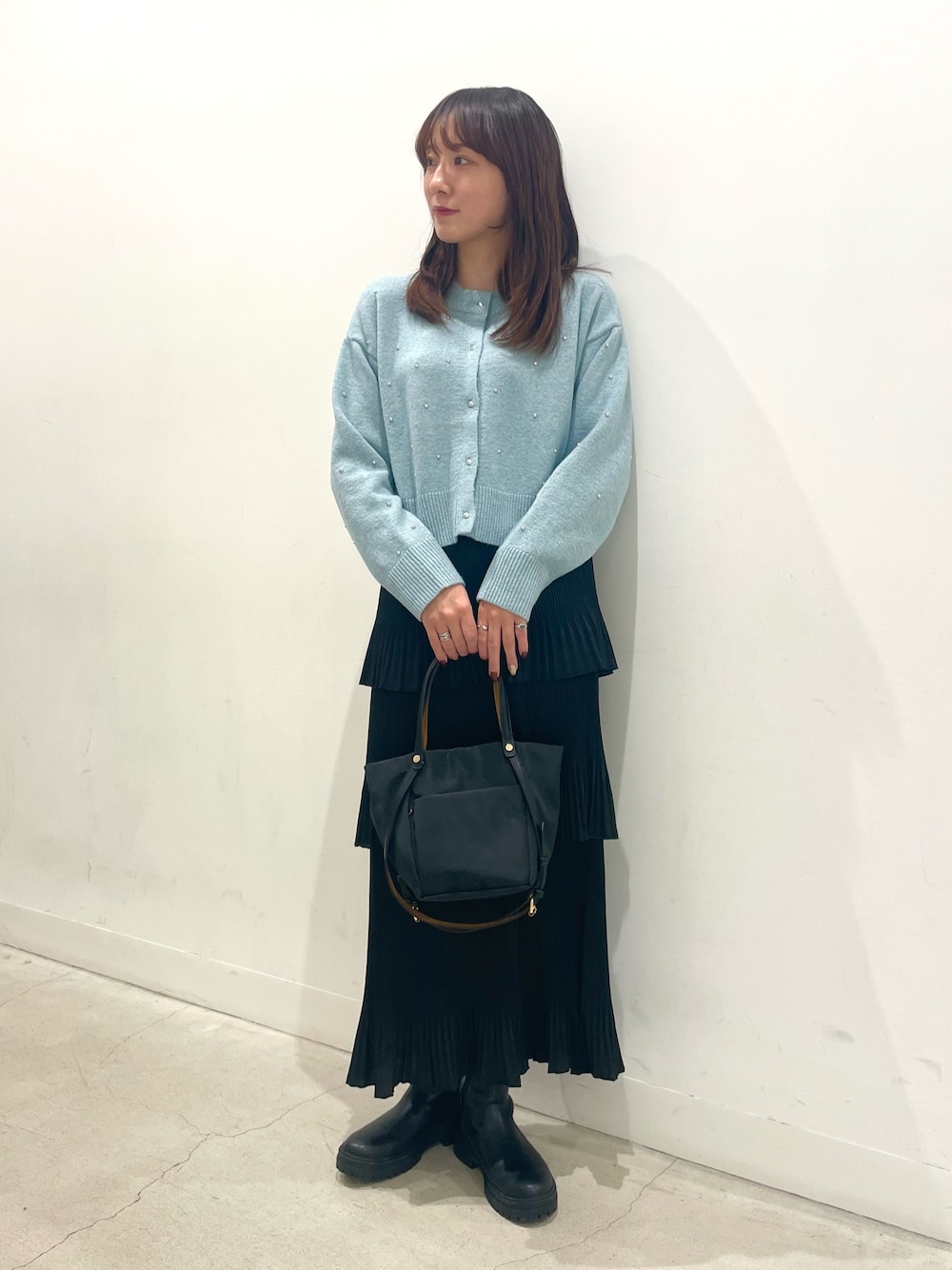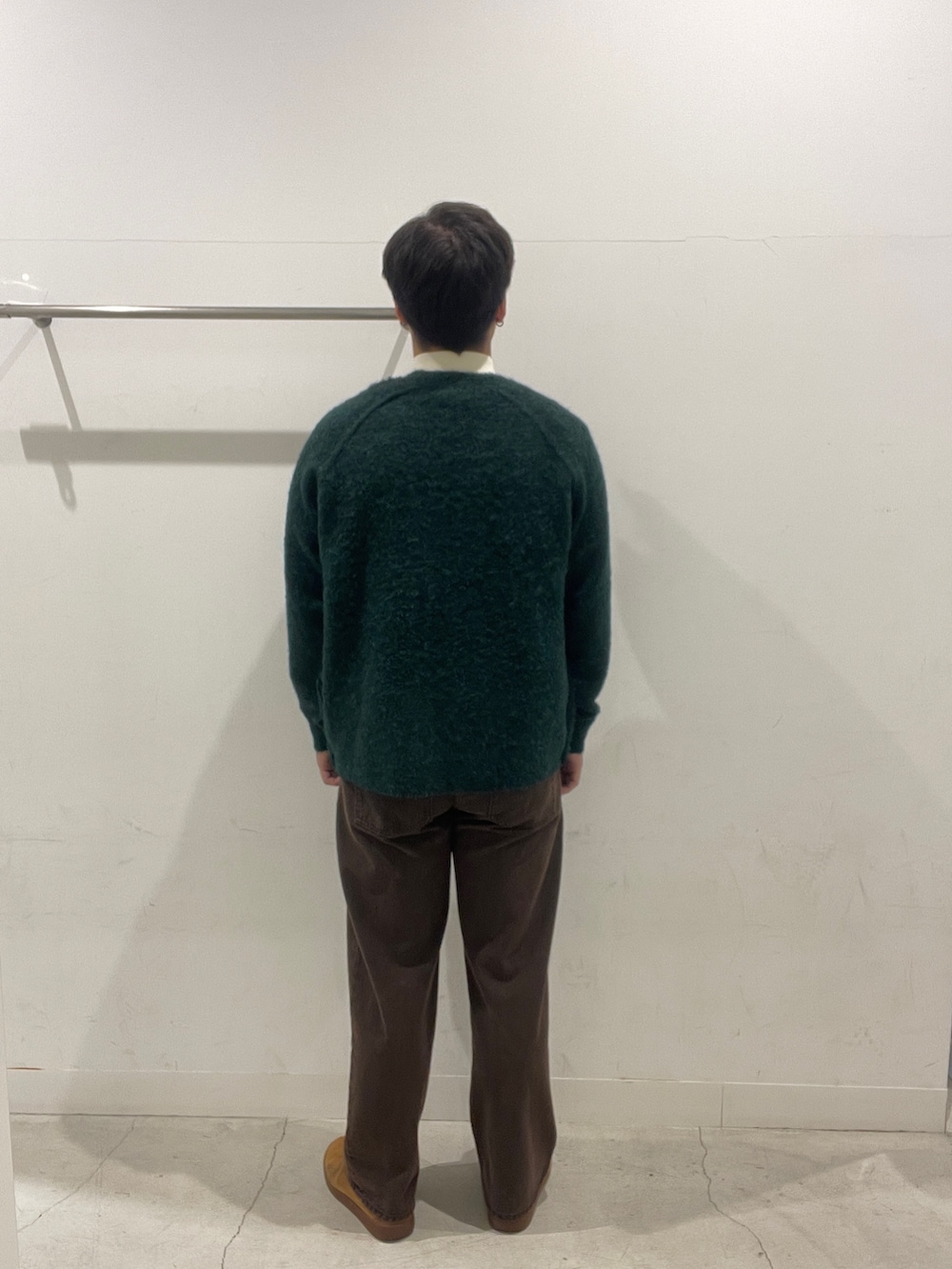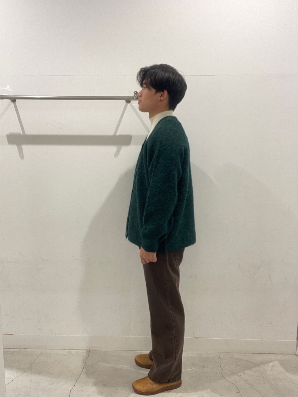 グリーンのカーディガンにベージュのモックネックで、やわらかく季節感を演出🟩