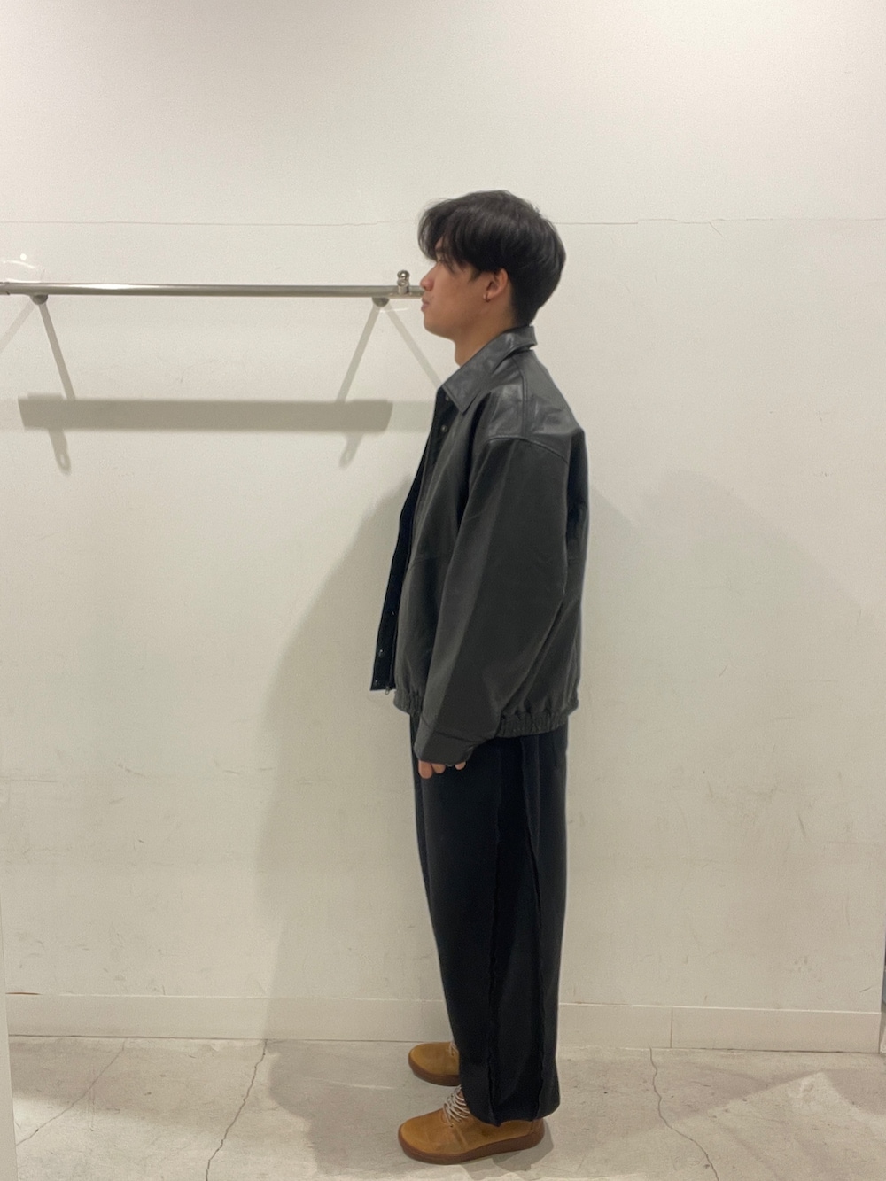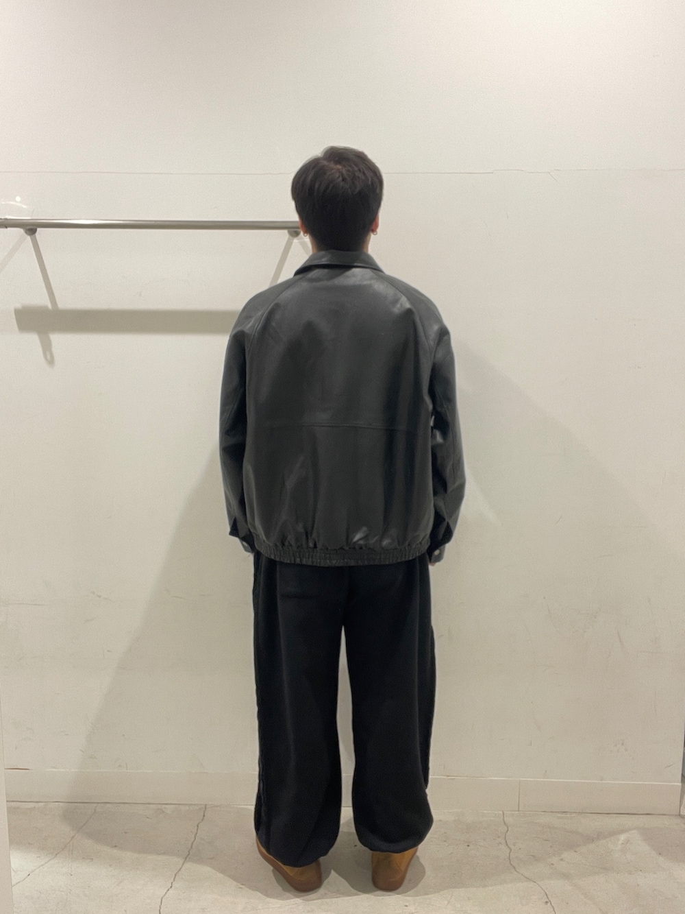レザージャケットにスウェットパンツを合わせて、抜け感のあるバランスに!