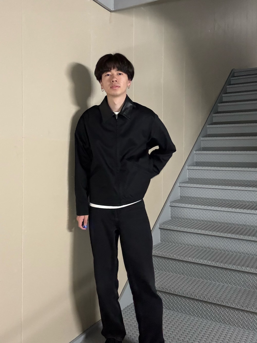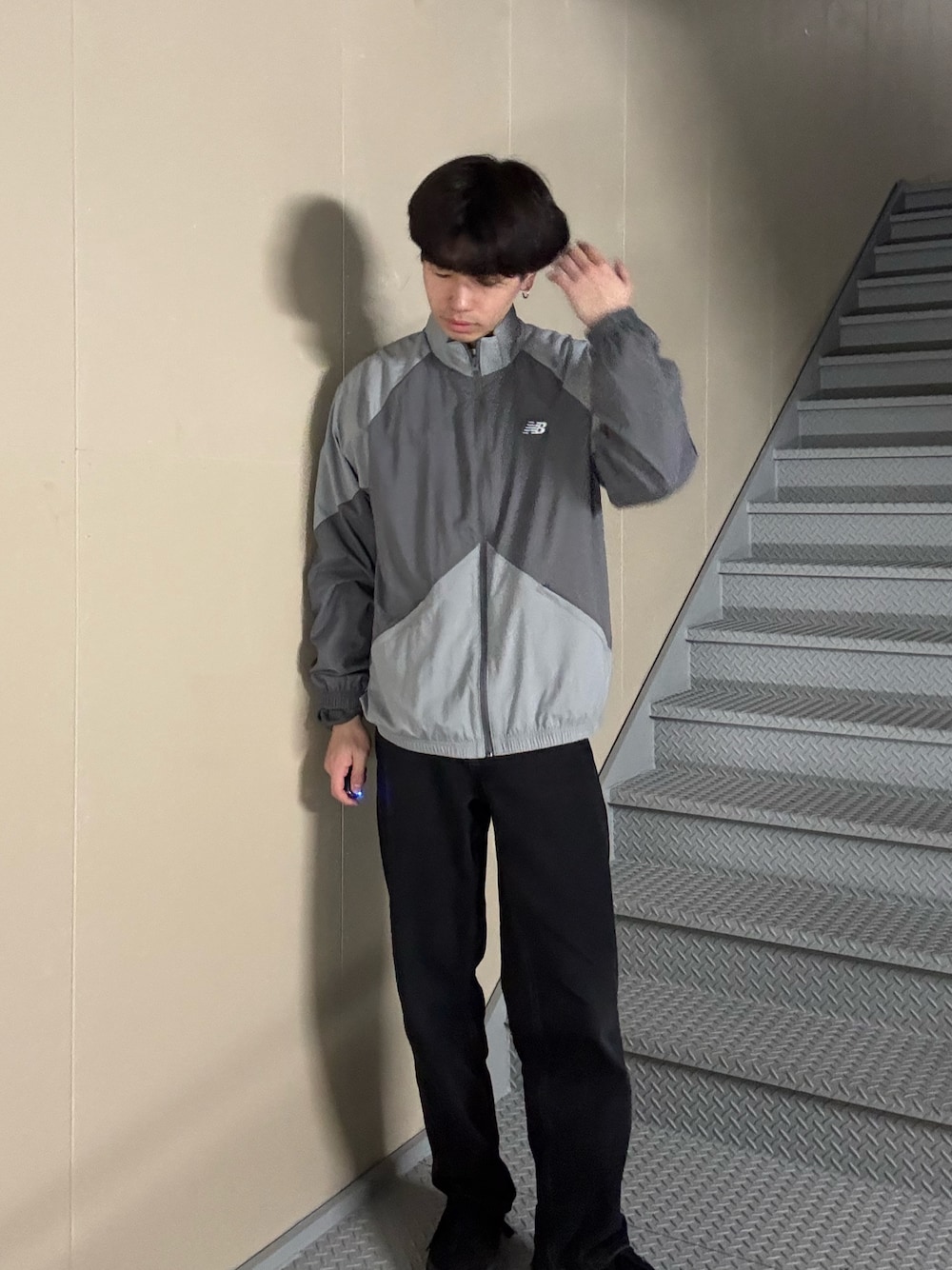 グレーのスウェットにブラックのパンツ、アウターを合わせた王道のモノトーンレイヤード。