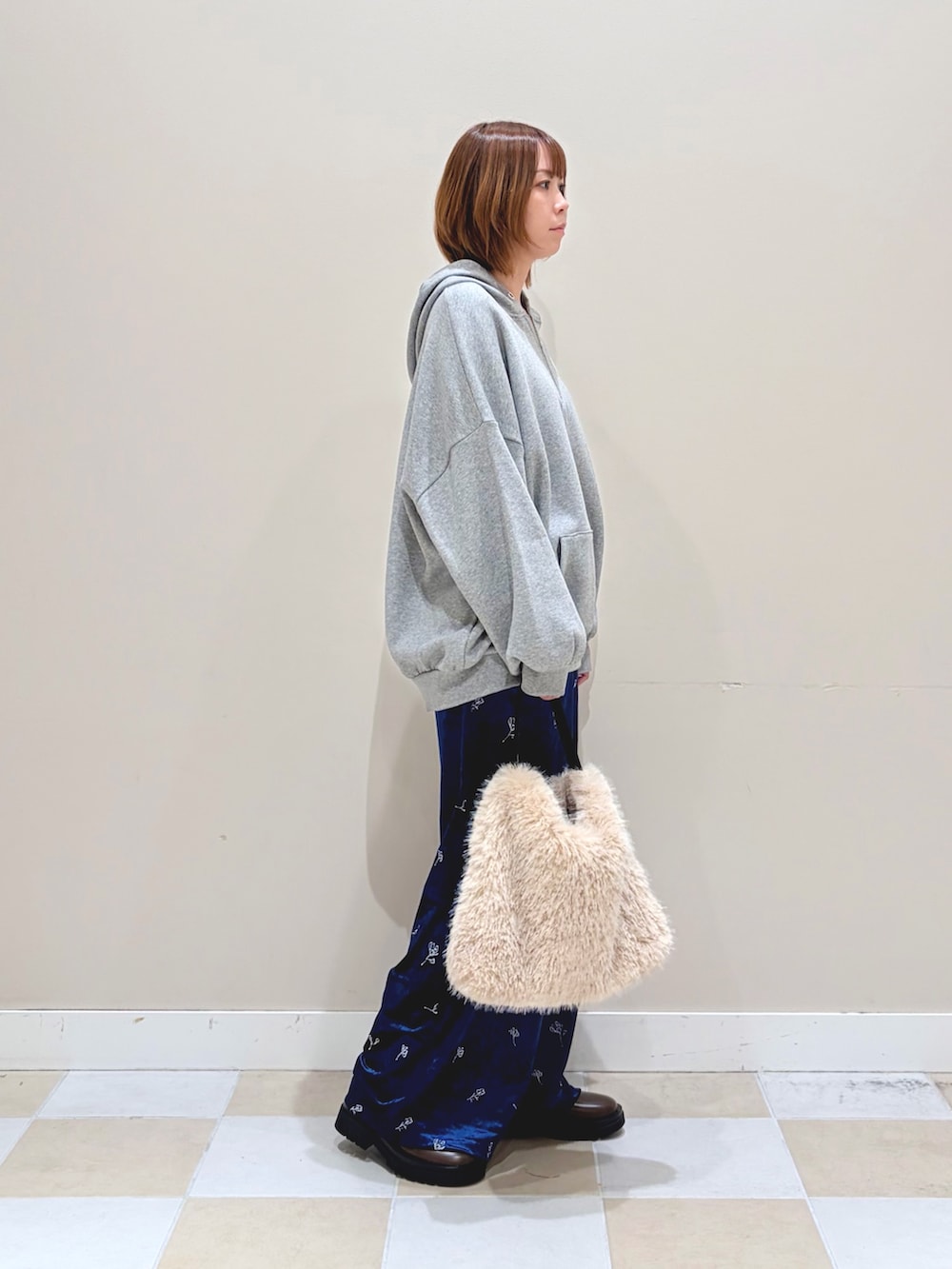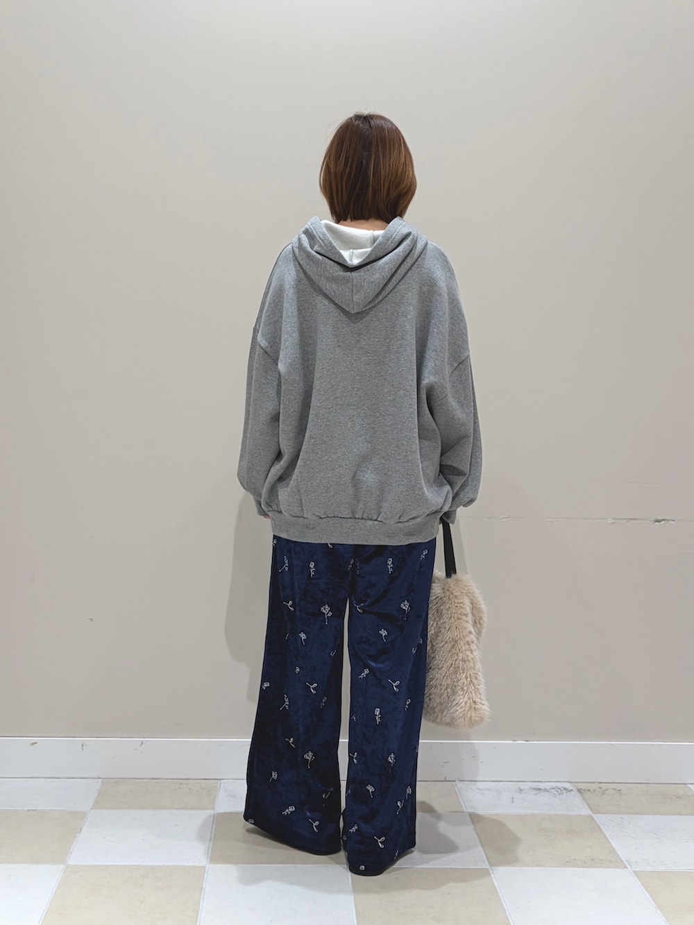 裏起毛で軽く暖かく着れる、オーバーサイズのハーフジップパーカーにベロア刺繍パンツでラフなスタイルにしました!