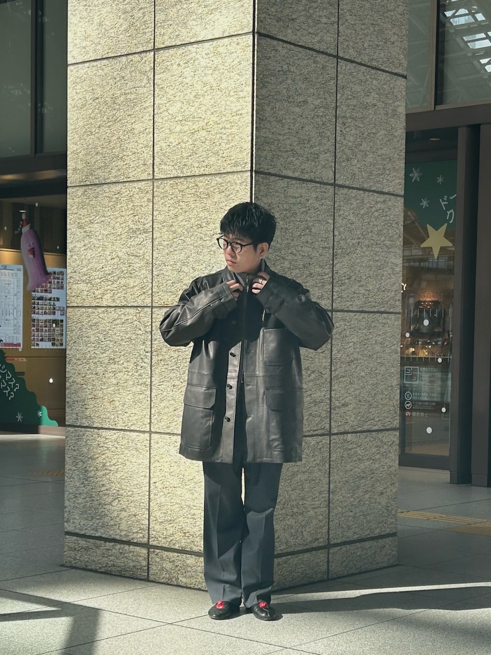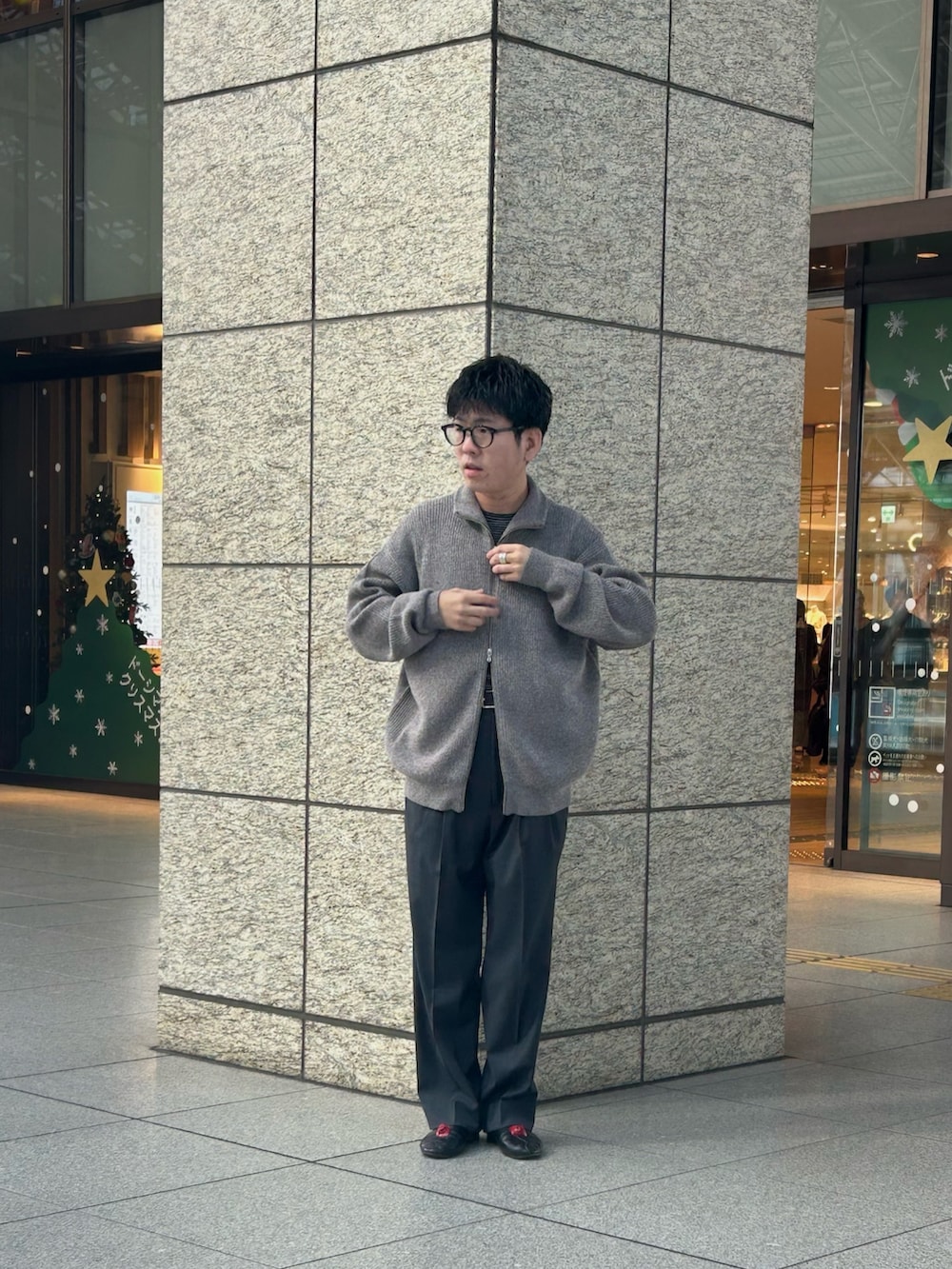 ストレートスラックスでスッキリとした印象に。