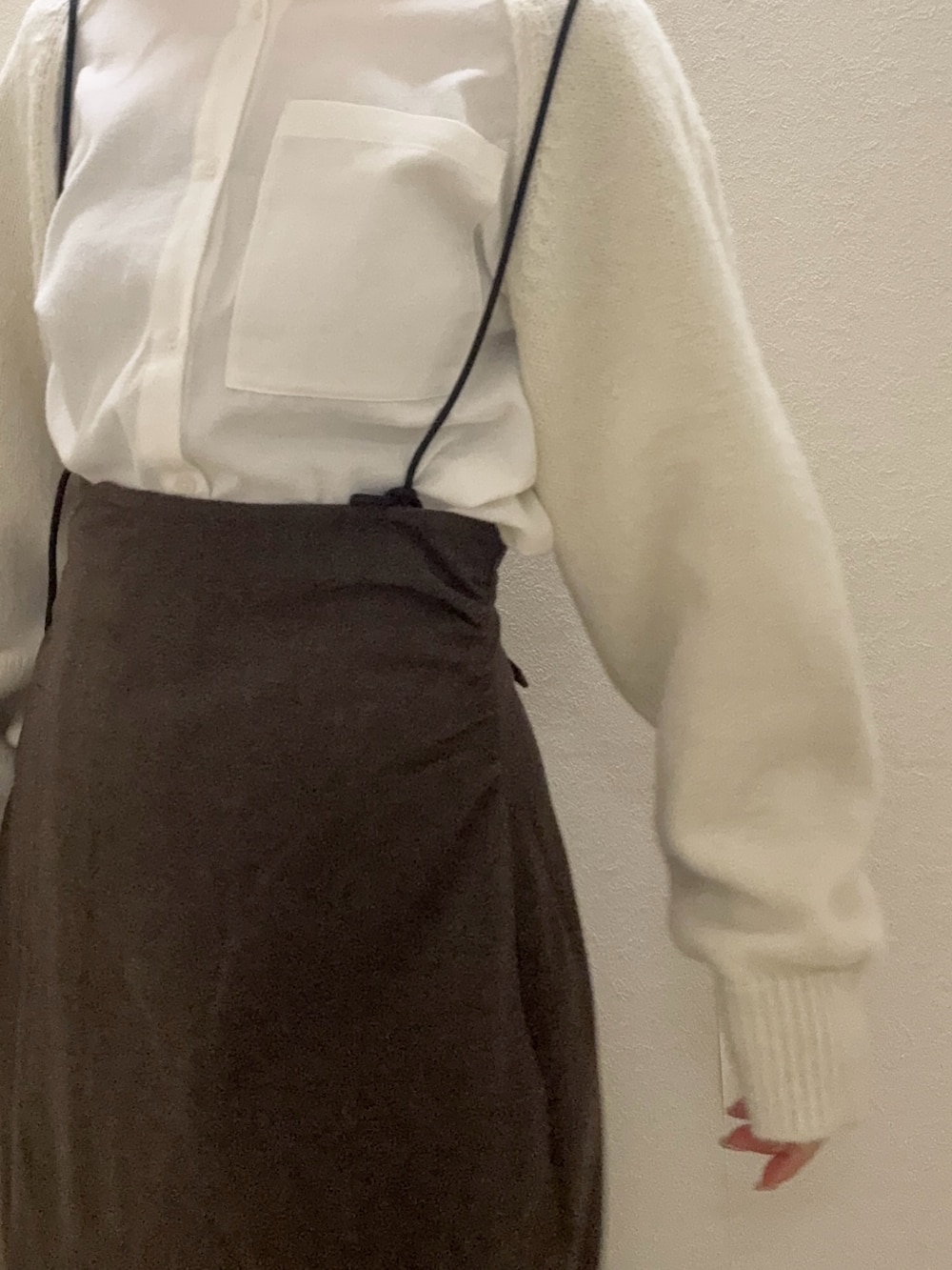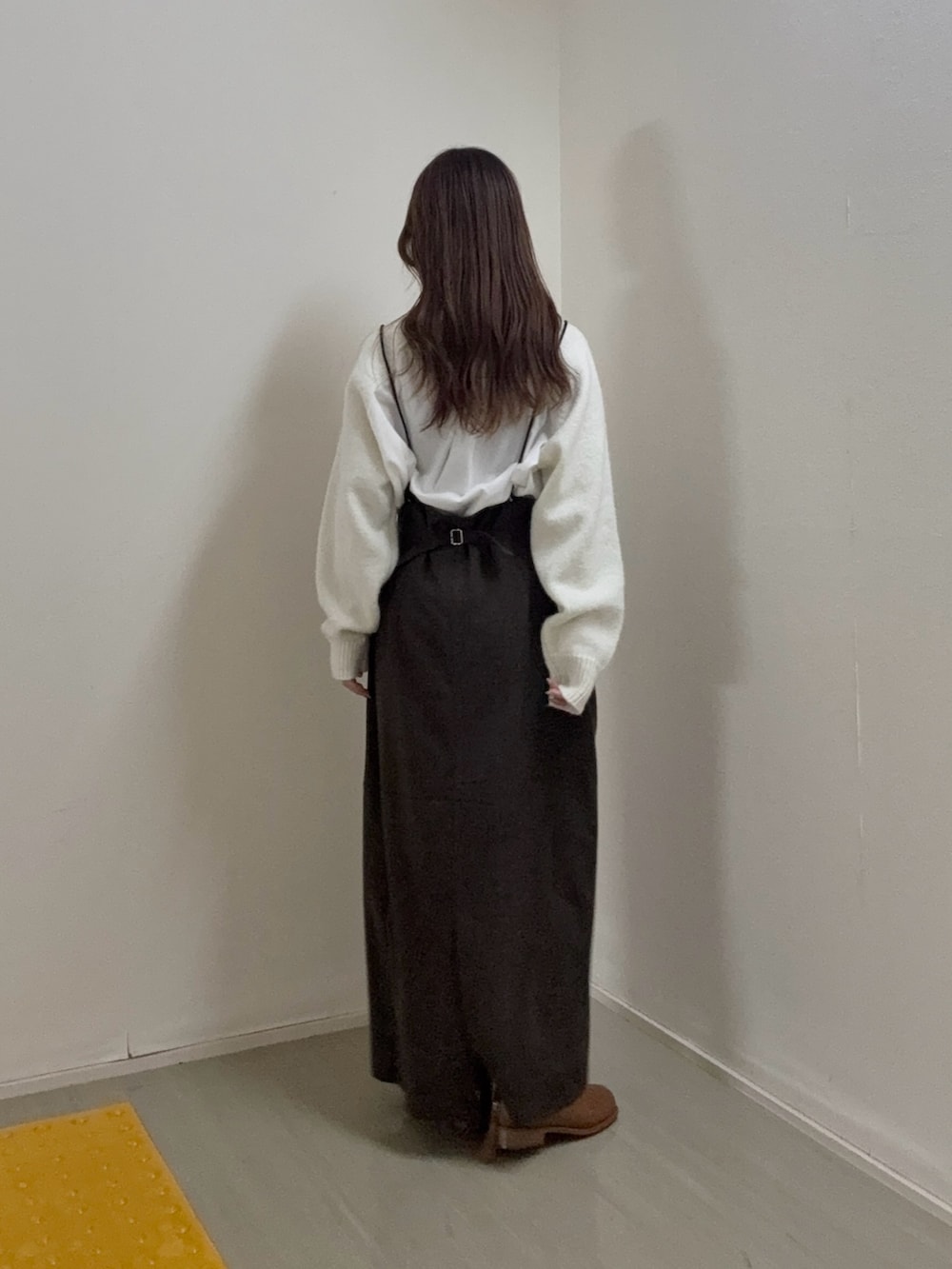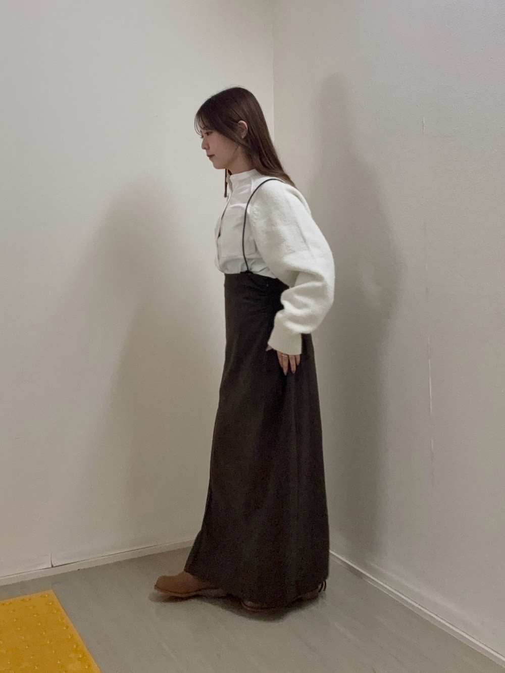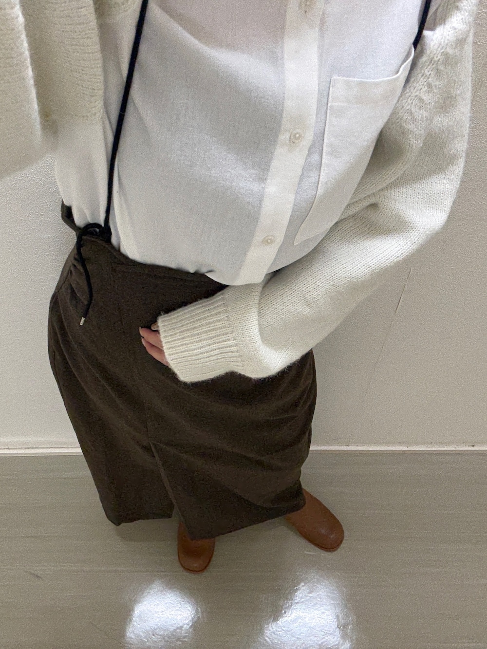 スカートはハイウエストで着ていただけるのでスタイルアップ効果が抜群です✨前サイドにスリットがあるので、ショートブーツで合わせるのがおすすめです👢