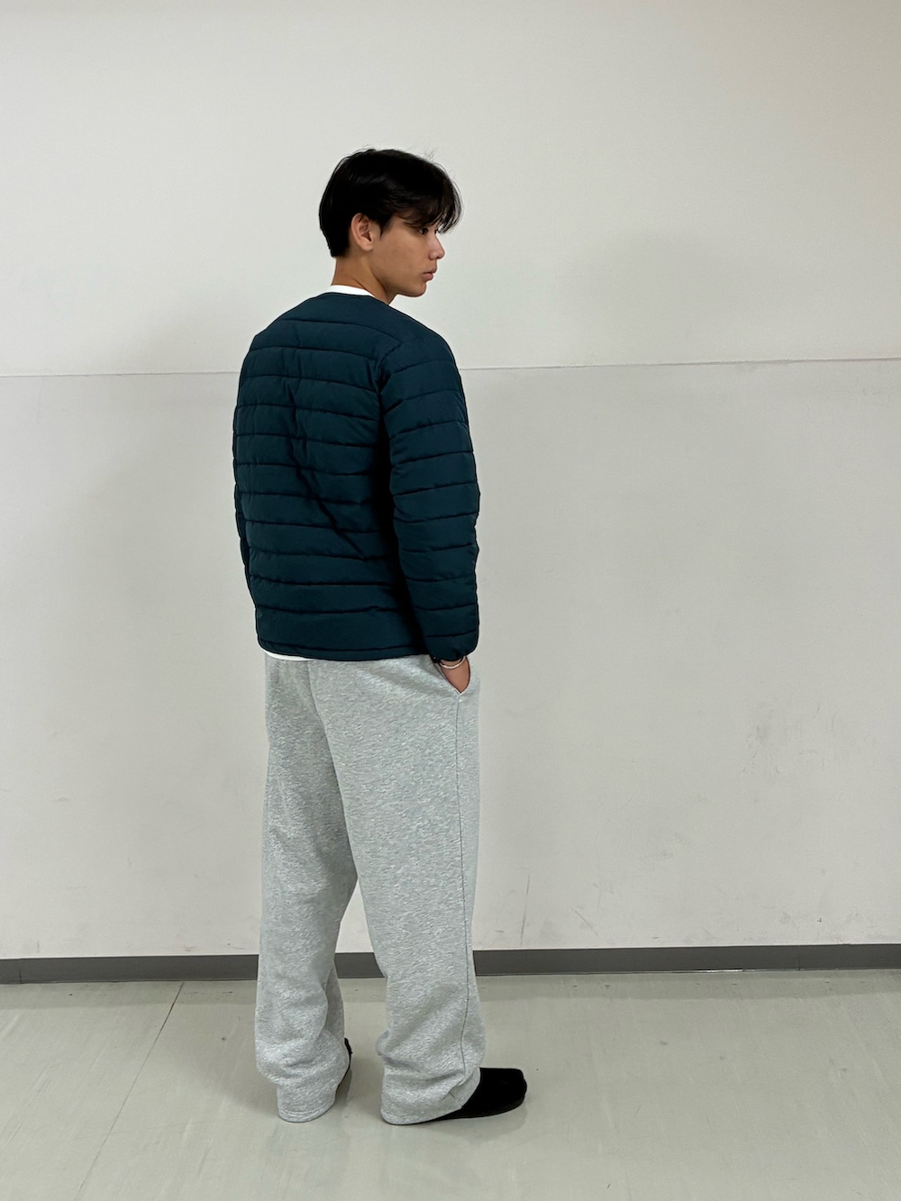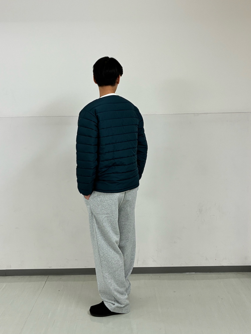 寒くなってきたので、あったかいダウンブルゾンを主役にコーデを組みました。スウェットでにリラックスしつつ、アウターを濃い色にするだけで、ちゃんと「お出かけ着」に見えるのがポイントです。ノーカラーなのでパーカーとかとも合わせやすいのもポイントです。ラフ感重視だけど、手抜き感はゼロな、休日のスタイルにおすすめです。