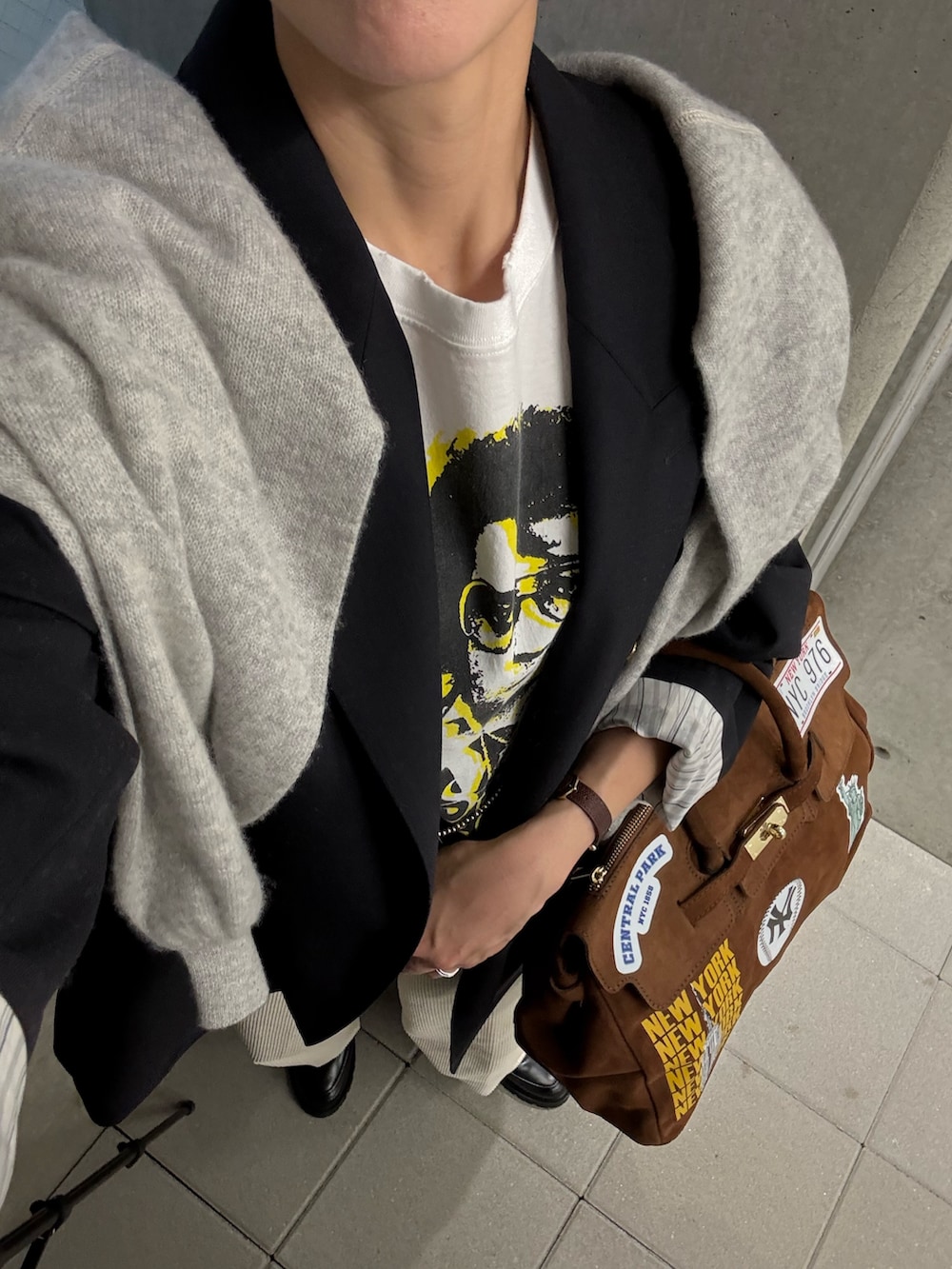 ジャケット、Tシャツ、肩にかけたニット