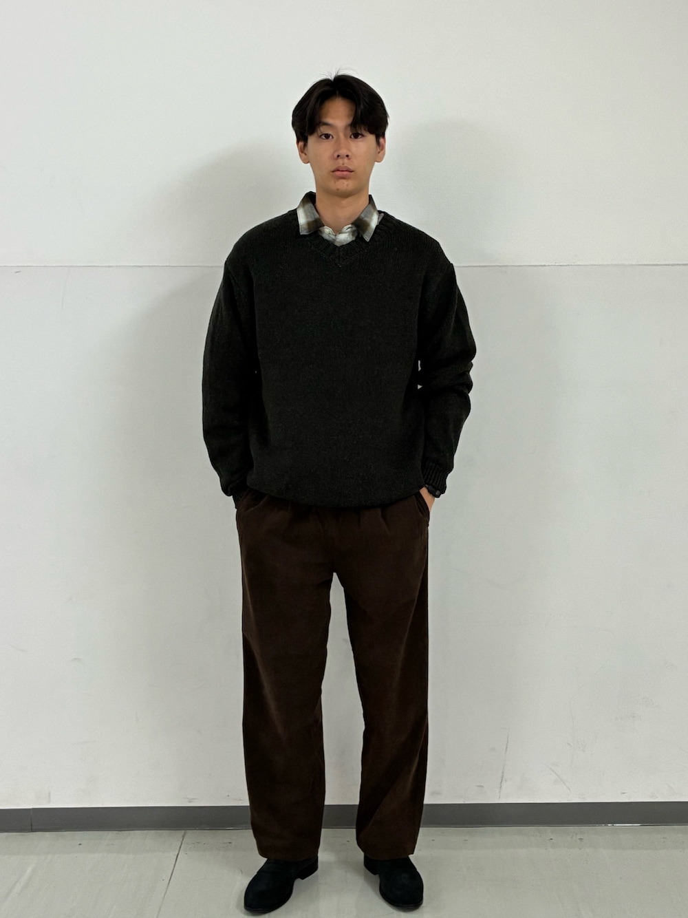 ボトムスは黒のパンツで全体を引き締めつつ、足元にはリラックス感のあるSUBUを着用しています。アウトドアとストリートの要素をミックスした、暖かくて動きやすいスタイルです。