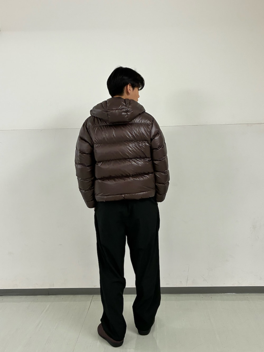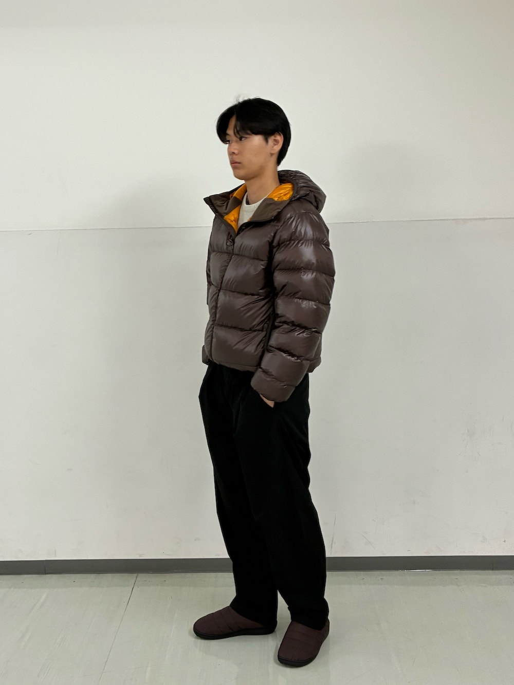 ブラウンのダウンと裏地の鮮やかなオレンジのコントラストが目を引く一着です。インナーにはシンプルな白のニットを合わせ、上半身に軽さを出しました。