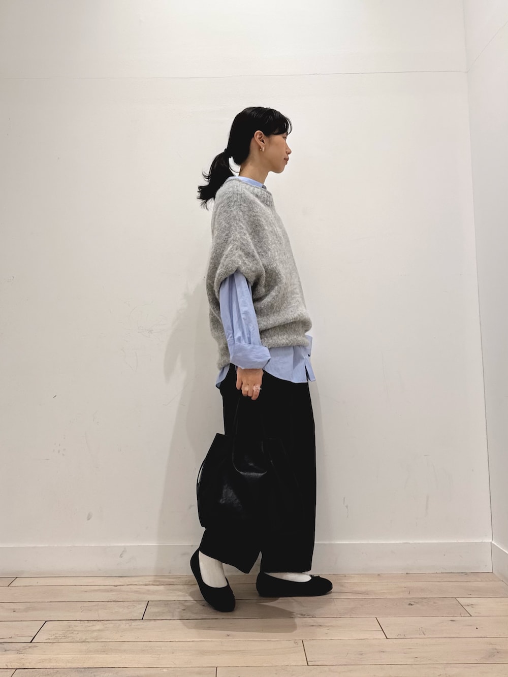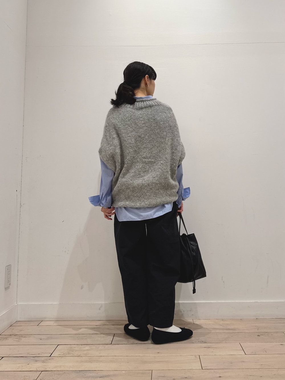 アルパカルーズベストはドロップショルダーでゆとりがあるので、シャツはもちろんスウェットの上から着てもかわいいです◎