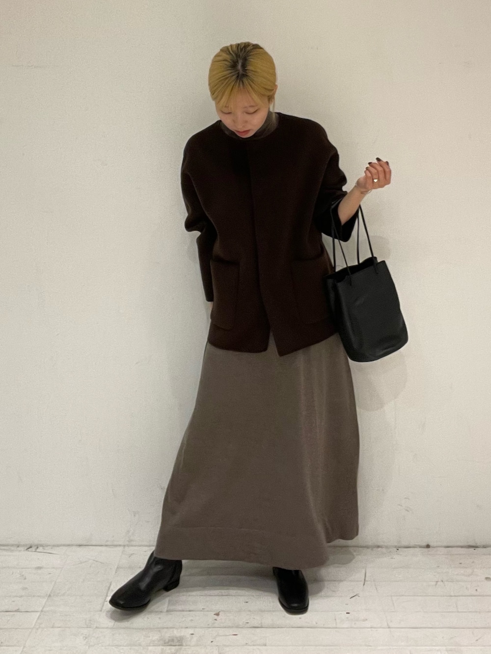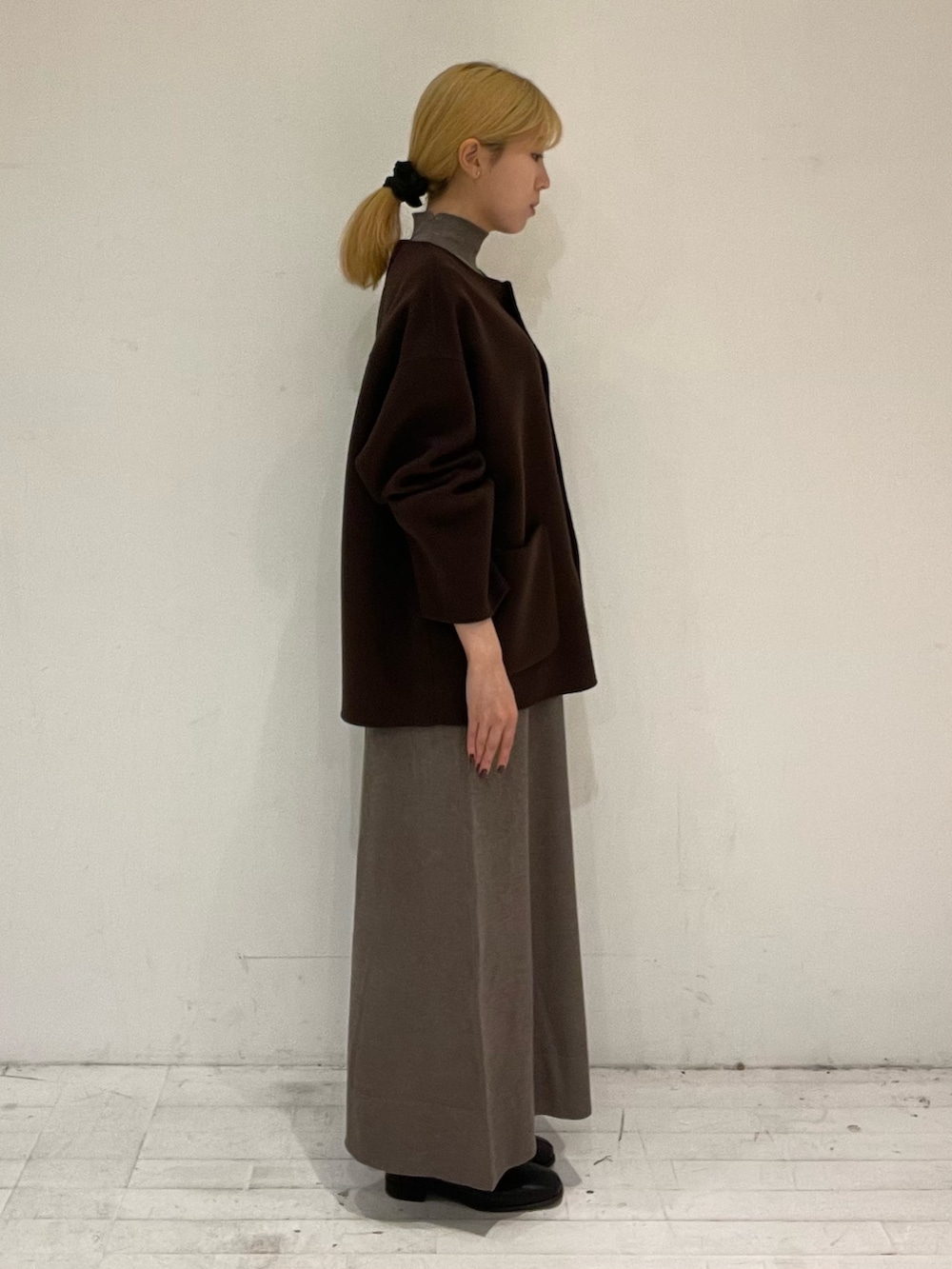 きれいなシルエットで、お尻周りもカバーできる襟なしのコートです