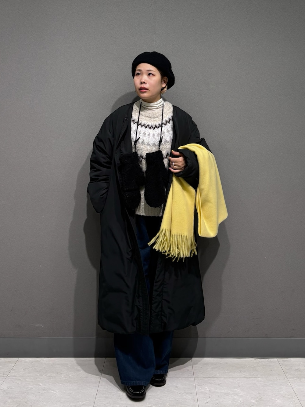 中綿のアウターはロング丈でふわふわ。