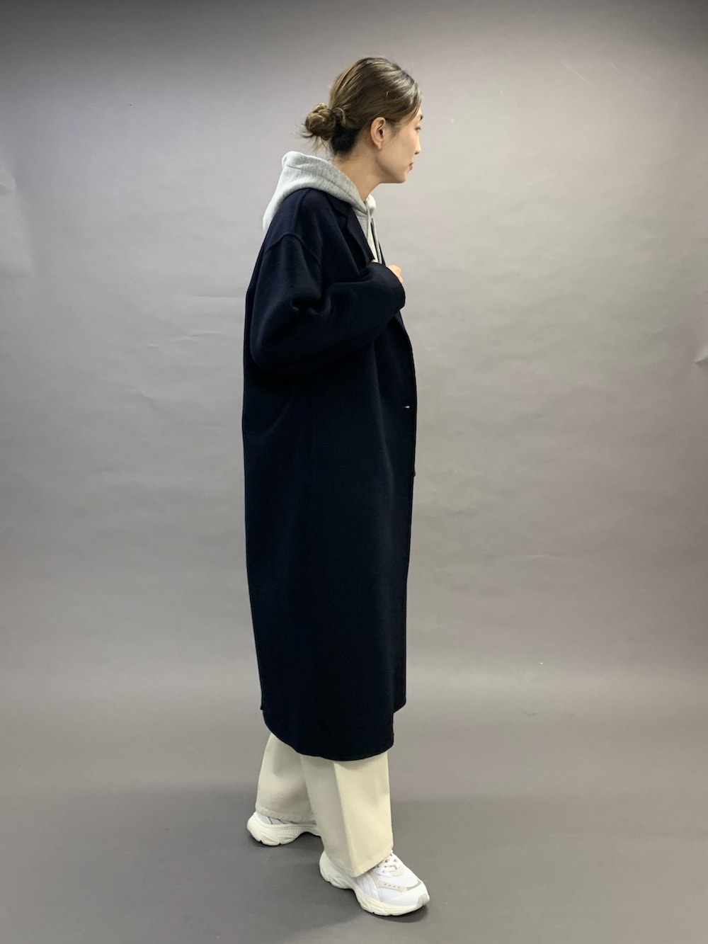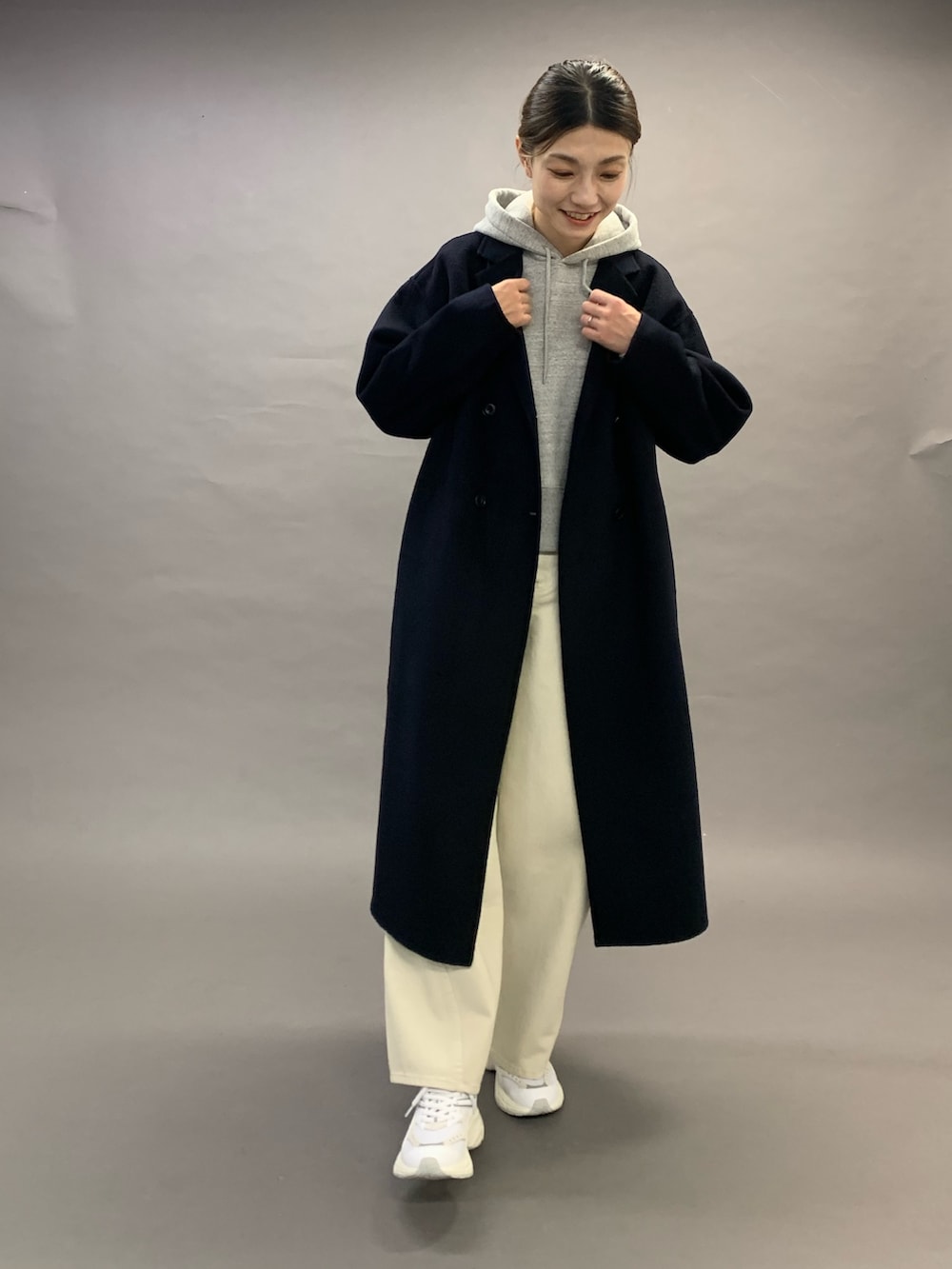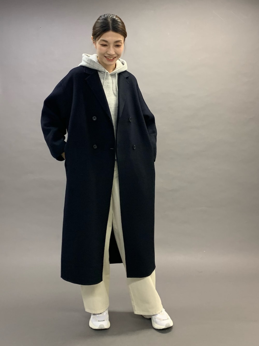カーブパンツにスニーカーとカジュアルなコーディネートですが、全体的にスッキリとして見せてくれるコートです。