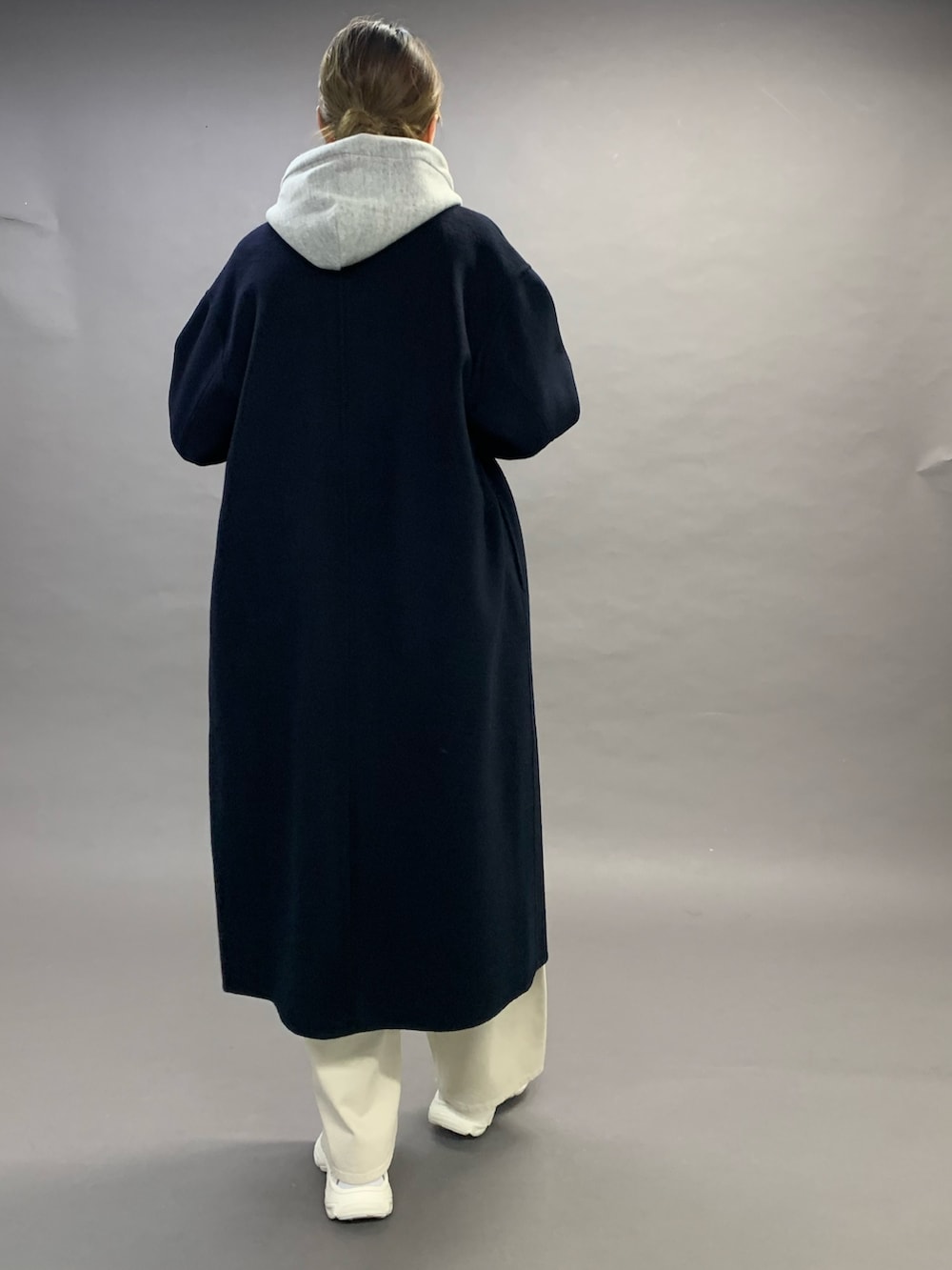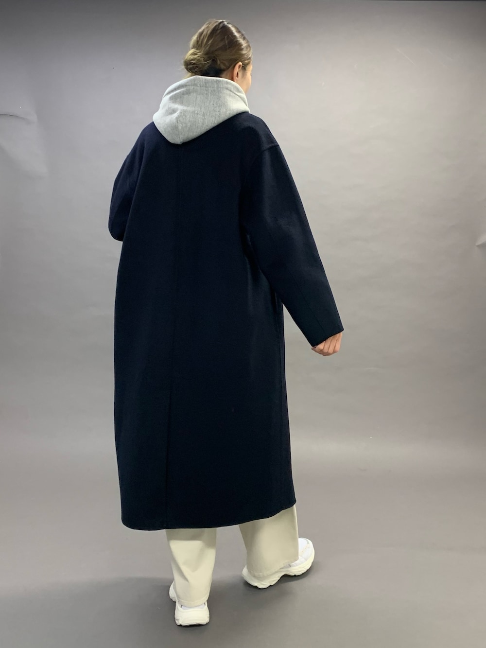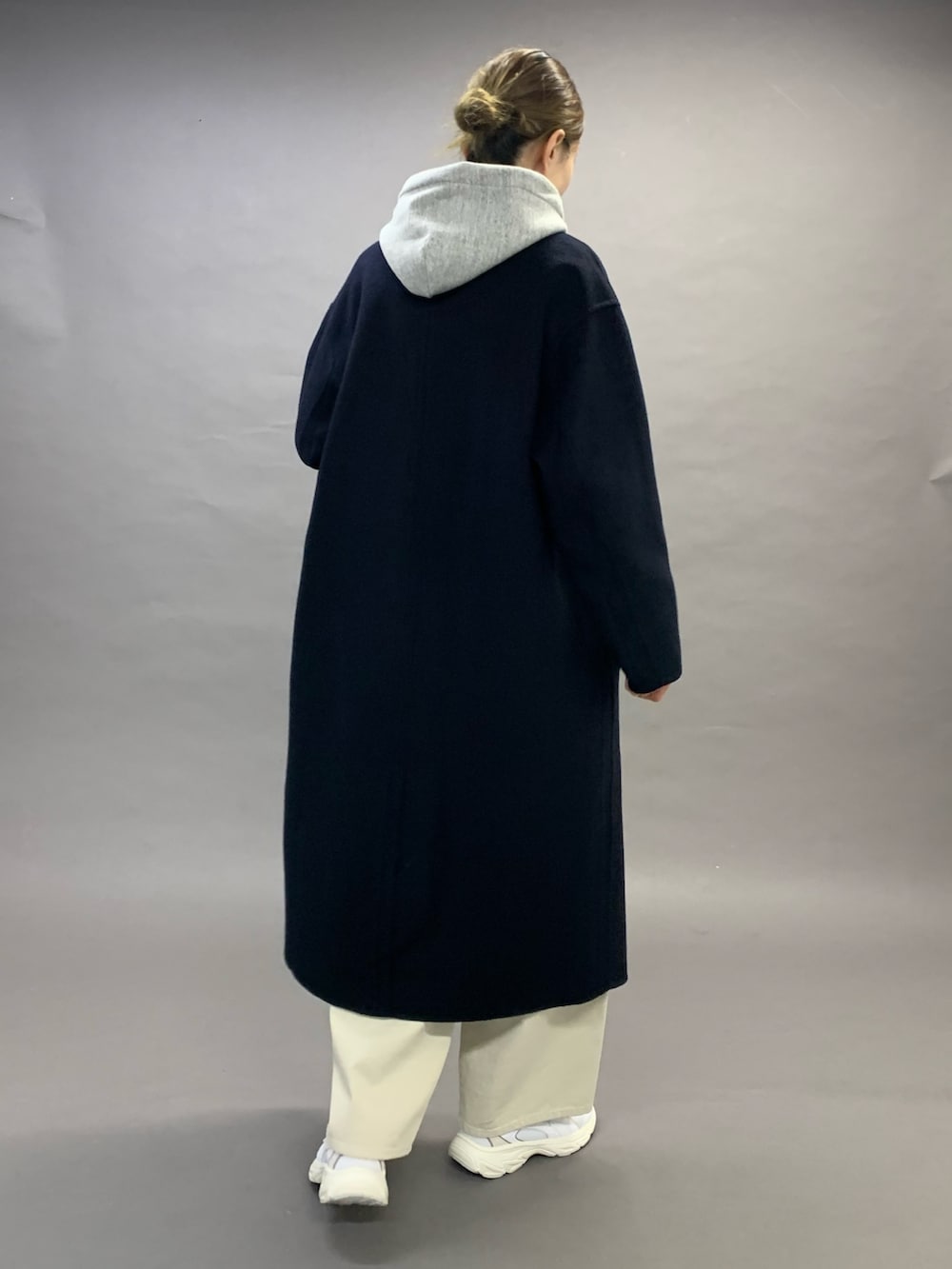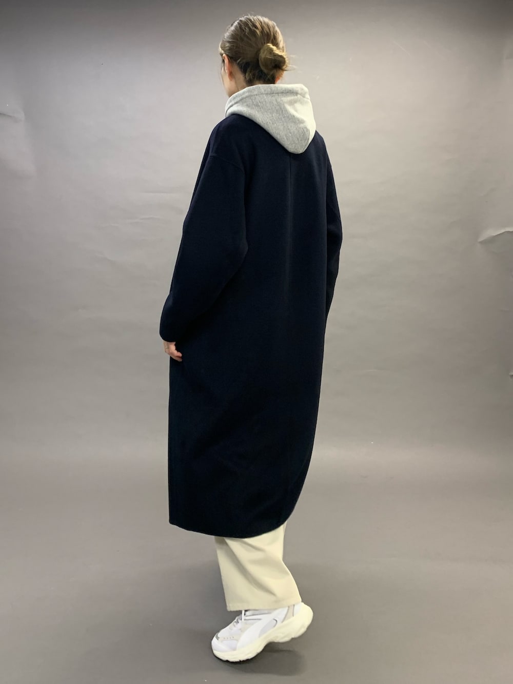 カーブパンツにスニーカーとカジュアルなコーディネートですが、全体的にスッキリとして見せてくれるコートです。