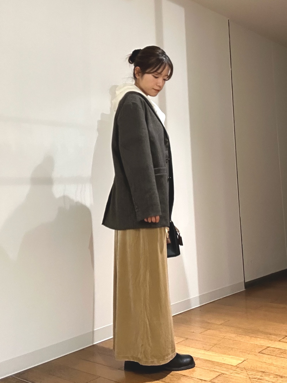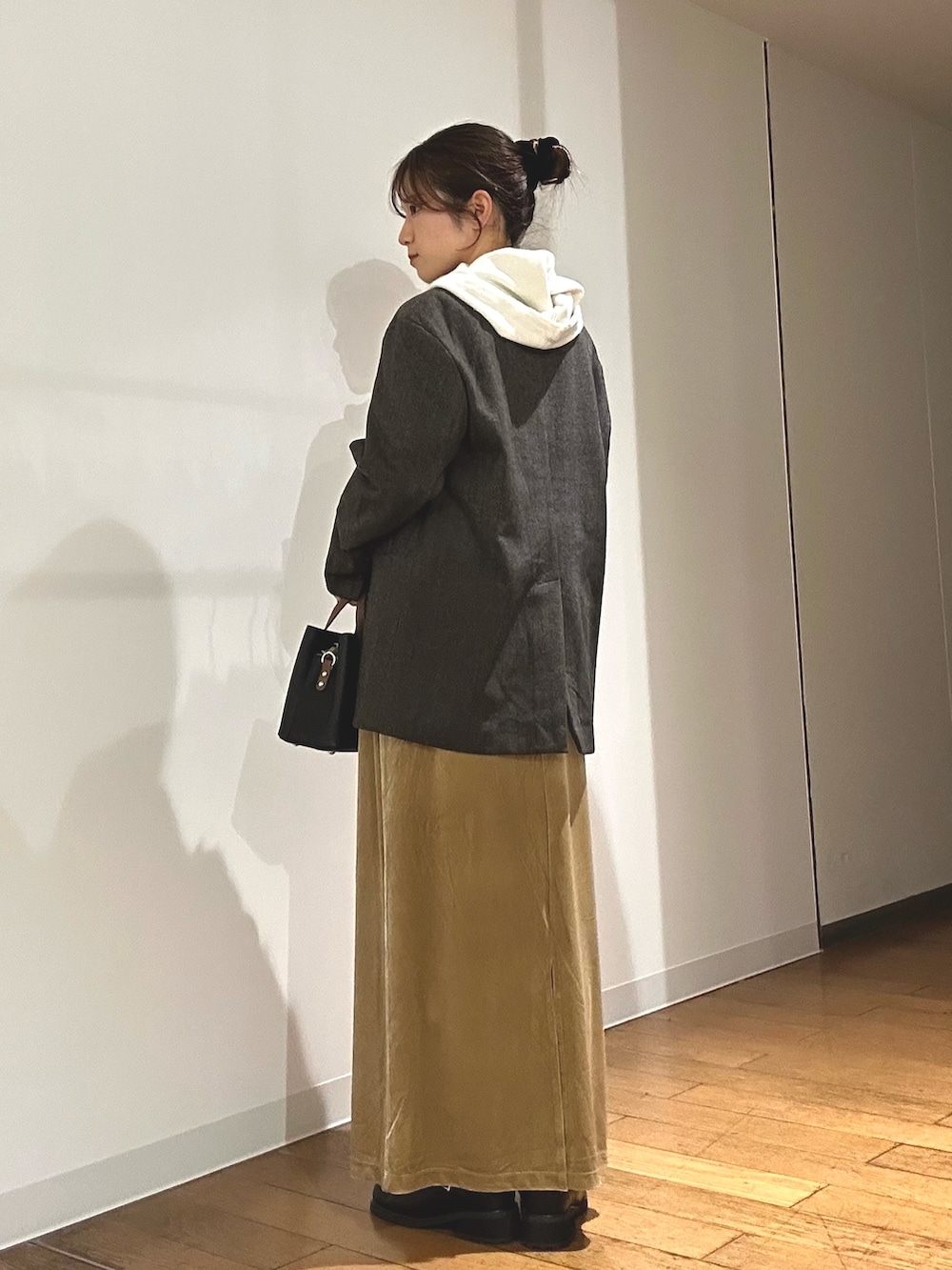 ベロアスカート合わせで一気に大人っぽ雰囲気になりますが、フーディーセーターを合わせてカジュアル要素をプラス◎