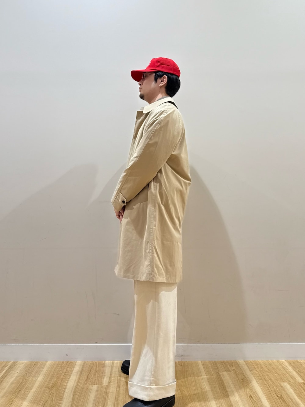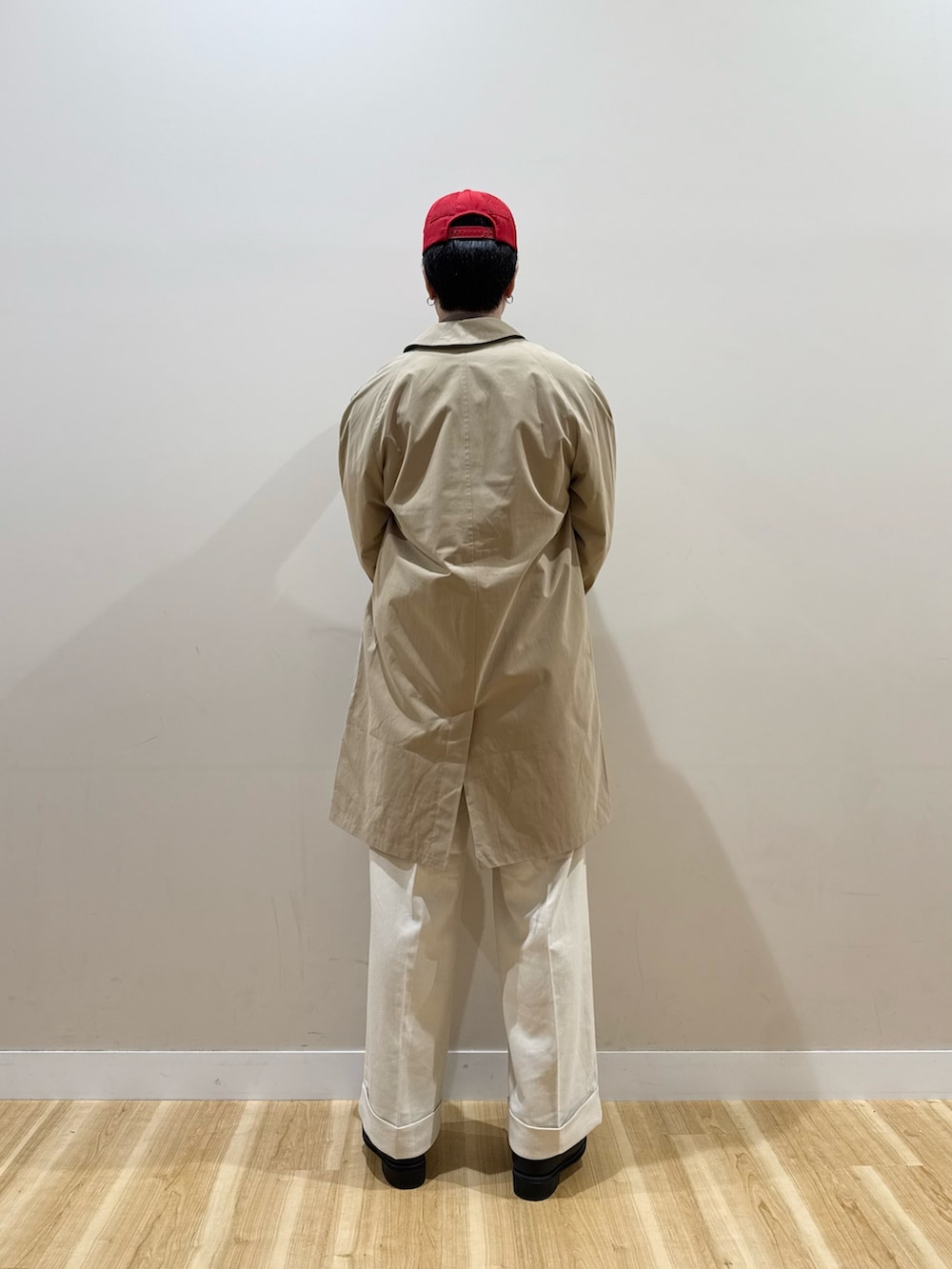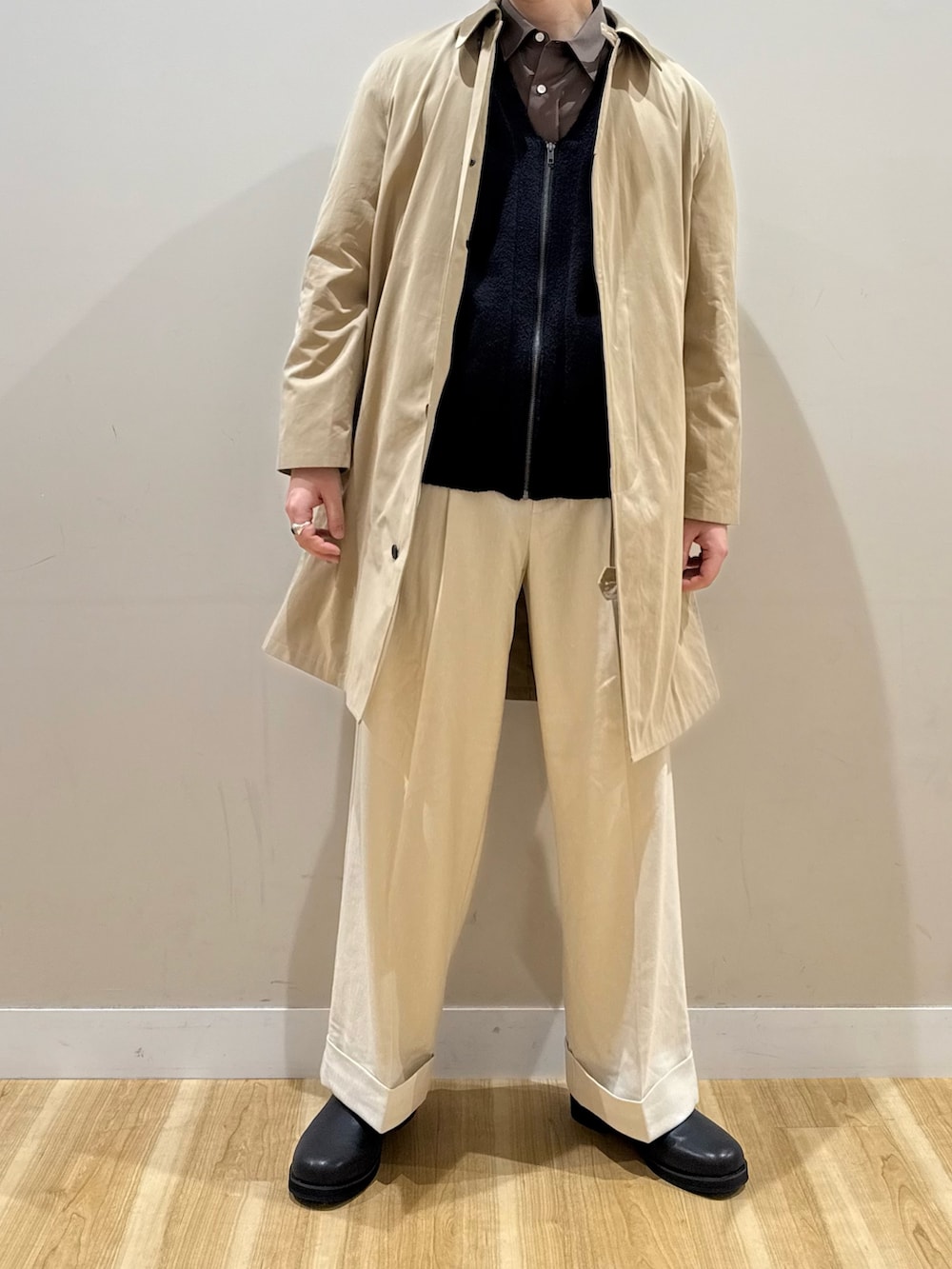 コートとパンツで明るめのカラーを使っているので、バランスを見てインナーは暗めに。