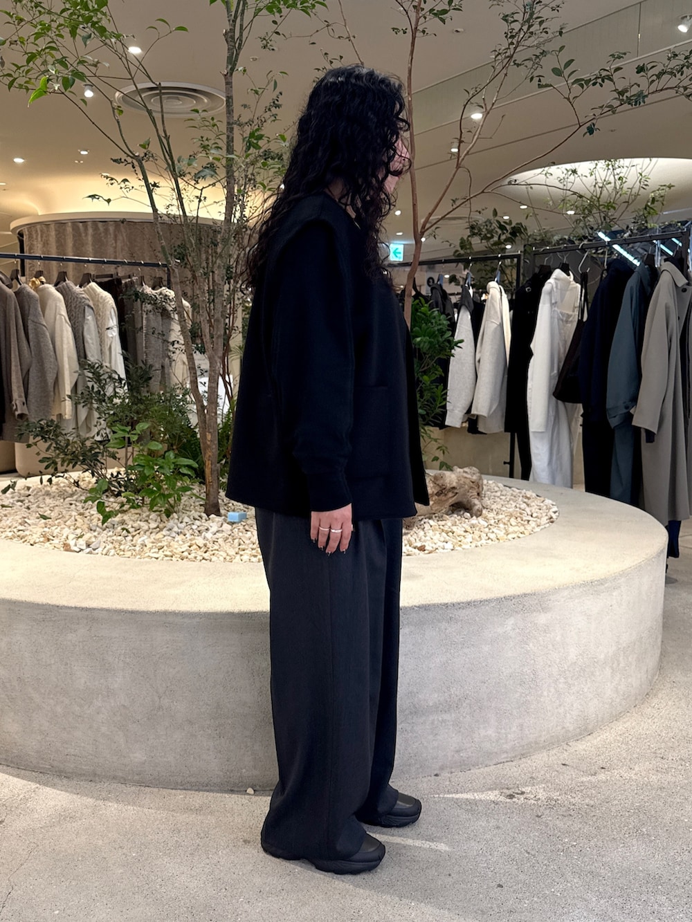 前開きでストンと落ちるシルエットがラフな印象になり過ぎず、ニットベストが苦手な方でもジャケット感覚で着れるアイテムです!